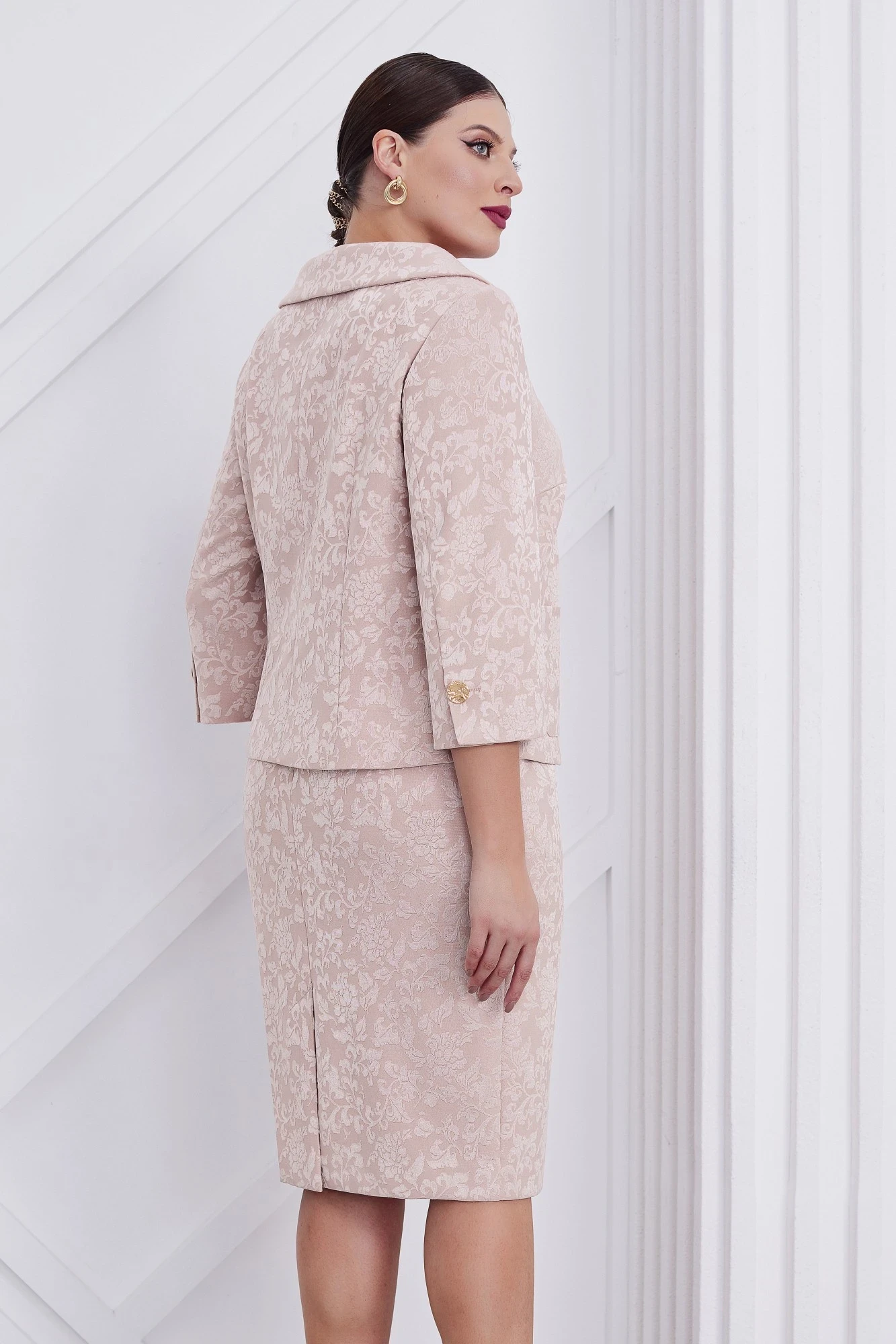 Элегантный дизайнерский костюм отличный выбор для любителей высокого качества и изысканного стиля. Жакет прямого силуэта с легким приталиванием и стоячеотложным воротником выполнен из мягкого жаккарда на трикотажной основе с барочным дизайном, хорошо тянется и приятная к телу. Перед с центральной застежкой на петли и пуговицы и настрочными карманами, оформлен отрезными бочками с нагрудными вытачками. Спинка со средним швом и талиевыми вытачками. Рукава втачные, свободные с обтачной шлицей по низу. Маленький дизайнерский штрих акцент на итальянские пуговицы на рукаве и по переду. Юбка карандаш с отрезным поясом по бокам на резинке, застежка на потайную молнию в среднем шве спинки по низу шлица. В изделии применена современная европейская обработка. Жакет и юбка на подкладке