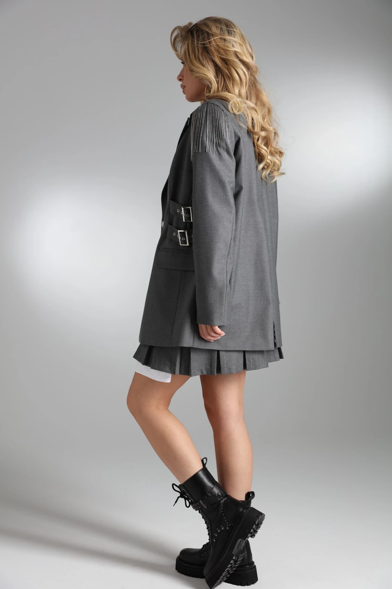 Однобортный объёмный жакет на подкладке прямого силуэта из костюмной полушерстяной ткани высокого качества. По переду изделия прорезные карманы с клапанами. Рукава втачные двухшовные. Спинка со средним швом и завышенной шлицей. В качестве декора по верхней части оката рукавов пришиты цепочки, а по бокам выполнена имитация ремней из основной ткани с люверсами и пряжкой.