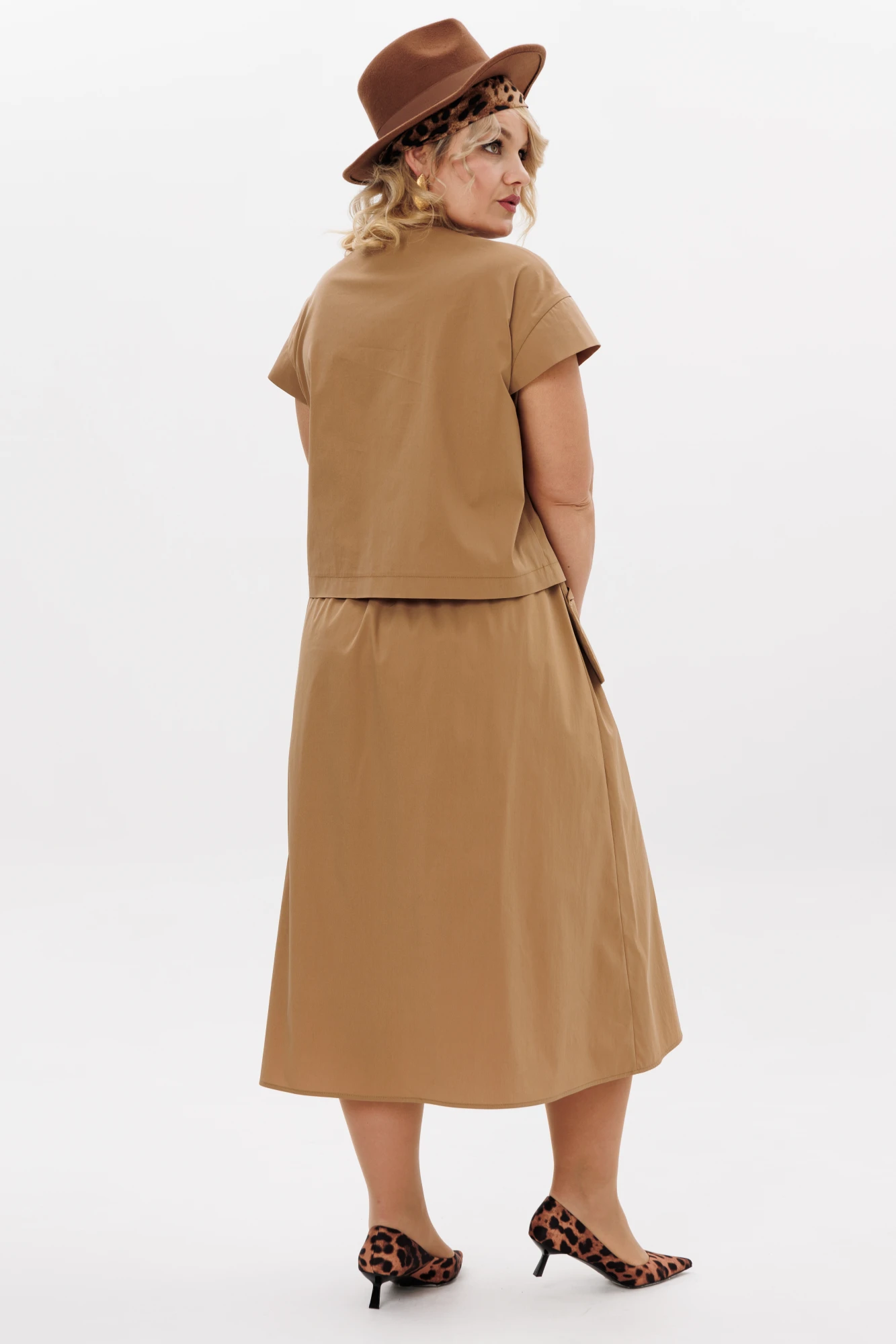 Комплект 2ка, состоящий из блузки и юбки. Укороченная блузка с короткими рукавами и застёжкой на пуговицы. Вырез горловины круглый. По переду блузки выполнен декор из основной ткани в виде цветов. Юбка - силуэта «трапеция», широкого объёма, длина миди, талия на резинке. Спереди юбка дополнена уникальными карманами, входящими в талиевый шов и свободно висящие по низу.