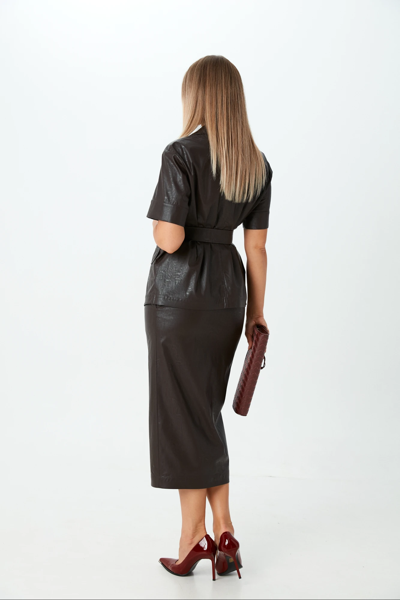 Комплект 2ка, состоящий из жакета и юбки. Жакет из экокожи на вискозе с короткими рукавами, без подкладки. Застёжка на пуговицы по центру. По переду имитация карманов с клапанами. В комплекте идёт пояс с пряжкой. Юбка-карандаш из экокожи длины ниже колена, на подкладке. По переду юбка расположена застёжка на пуговицы. По бокам карманы.
