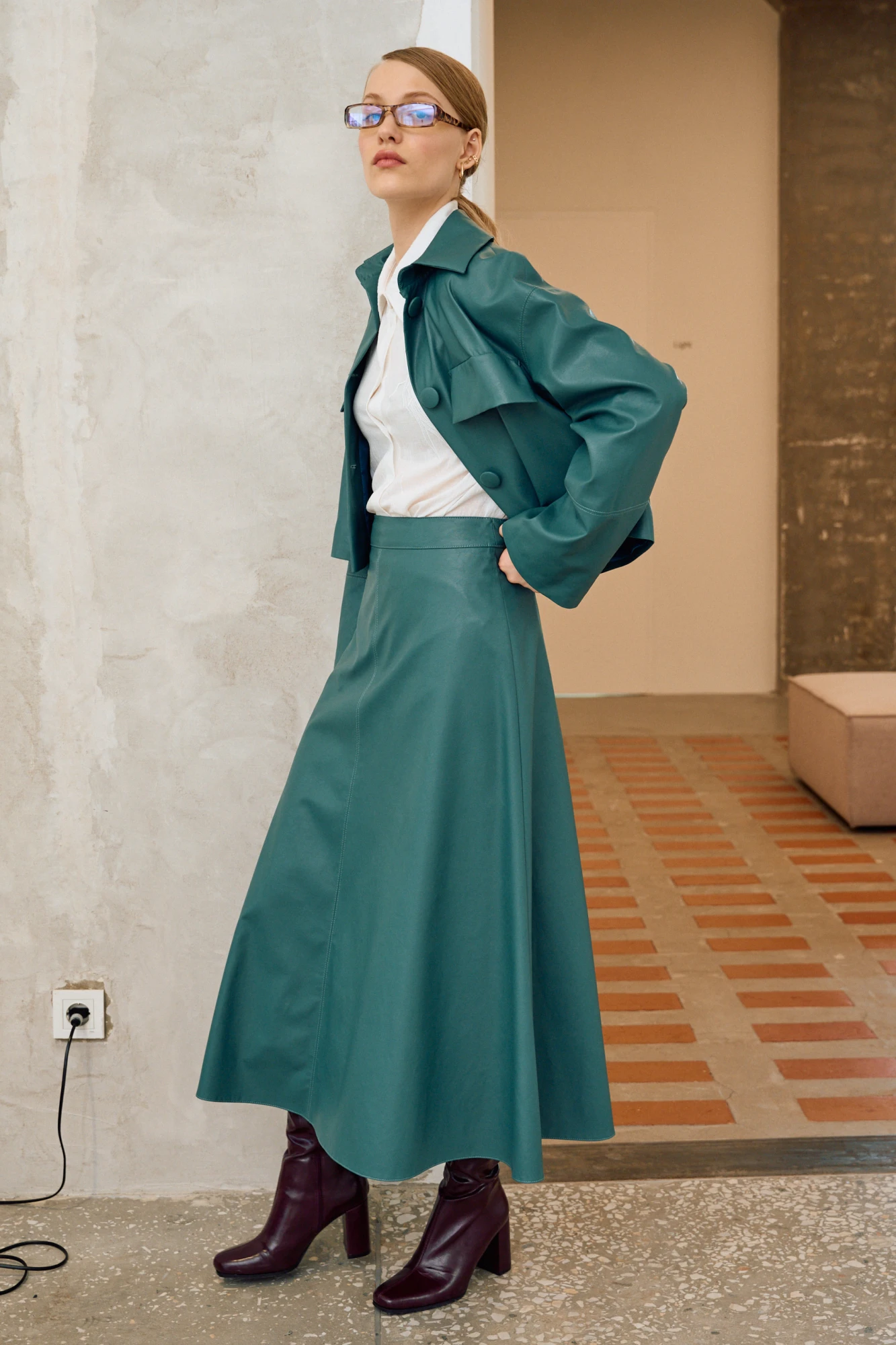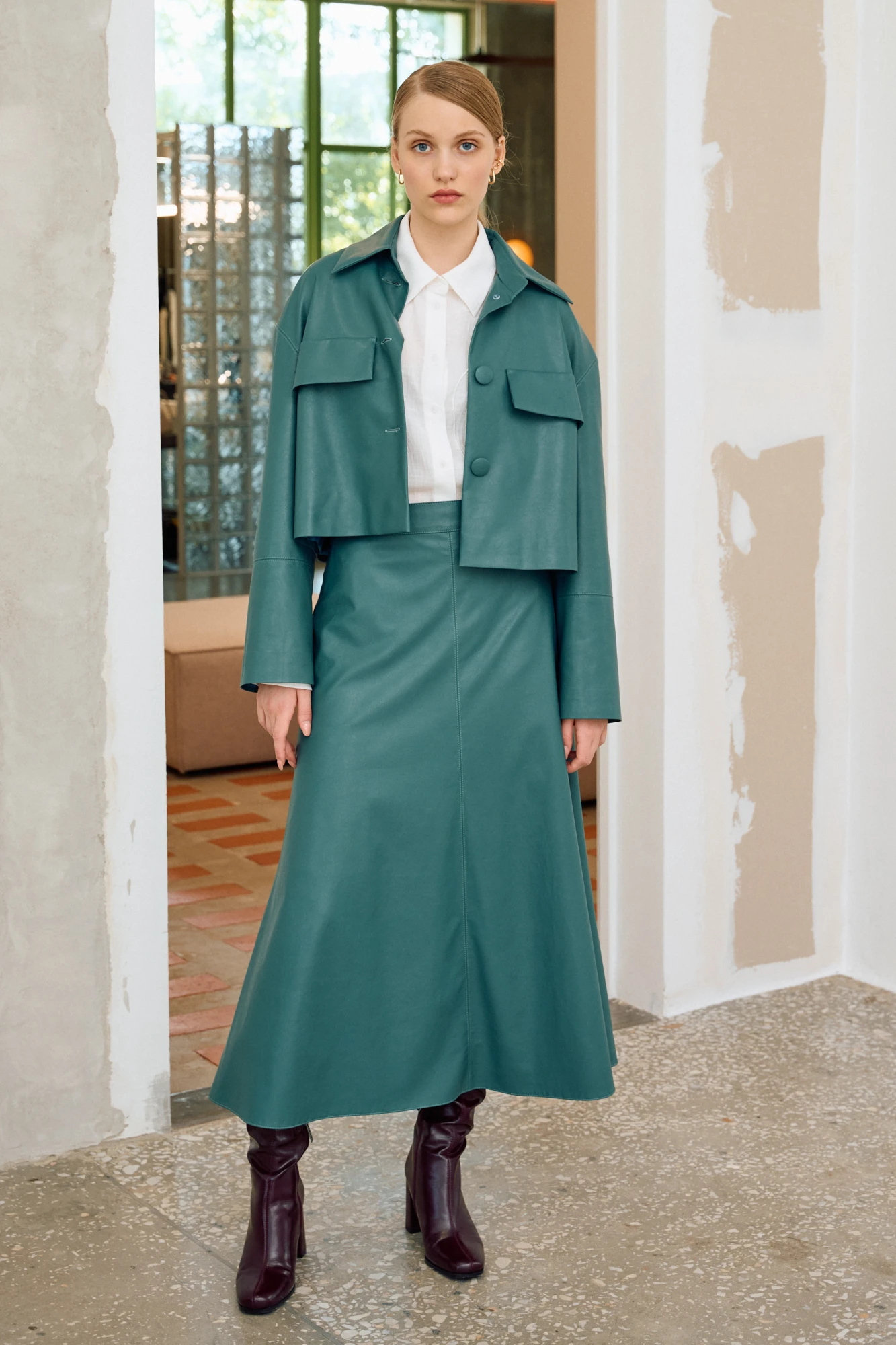 Комплект состоит из жакета и юбки, и выполнен из экокожи. Жакет укороченный, прямого кроя, на подкладке. Линия плеча спущена, рукав длинный, ниже уровня локтя подрез. Воротник рубашечного кроя, застежка на петли и пуговицы. Выше уровня груди отлетные клапаны. По спинке кокетка. Юбка А-силуэта на притачном поясе, на подкладке. По передней части юбки средний шов, по задней части юбки средний шов, переходящий в застёжку на потайную молнию.
