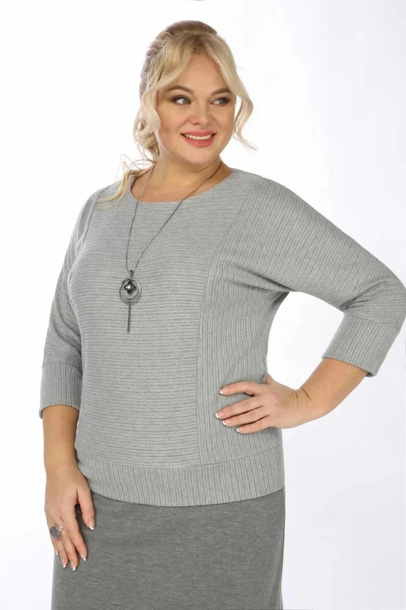 Длина блузона 63 см, длина рукава 54 см, ширина рукава на уровне глубины проймы 52-27 см, 54-28 см, 56-29 см. Длина юбки 66 см. Реальные замеры блузки 52 ог-116см, от-108см, 54 ог-120см, от-112см, 56 ог-124см, реальные замеры юбки 52 от-86 см, об-110см, 54 от-90 см, об-114см, 56 от-94 см, об-118см.