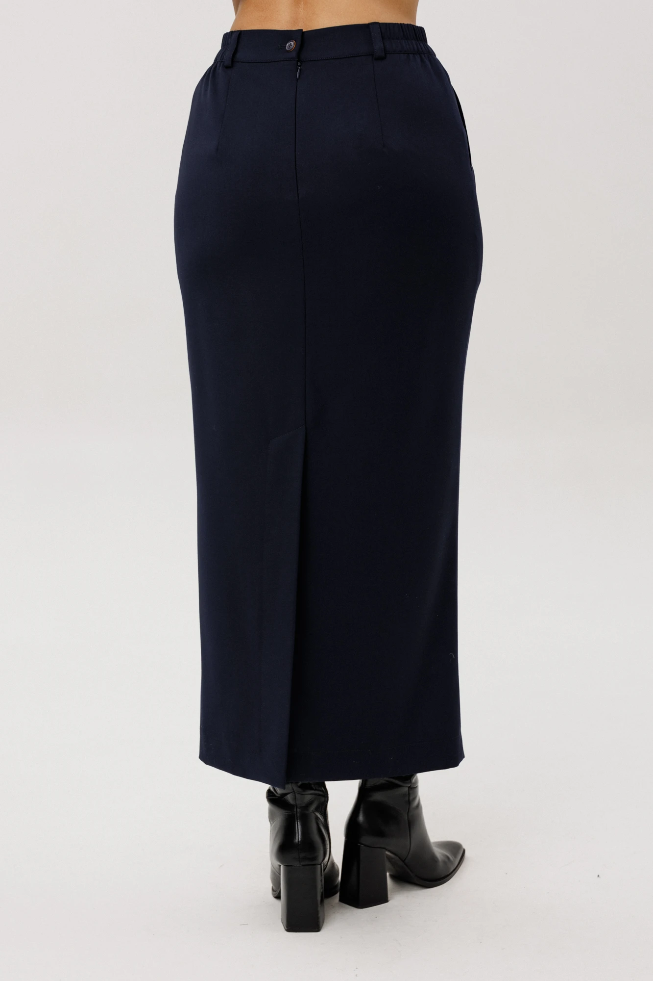 Костюм двухпредметный, состоит из джемпера и юбки. Джемпер свободного кроя с длинным рукавом. По низу широкая подгибка. Юбка прямиго силуэта на подкладке. По переду в боковых швах карманы. Застежка по центру задней половинки на потайную тесьму -молнию По низу среднего шва задней полвинки шлица. Линия талии регулируется резинкой.