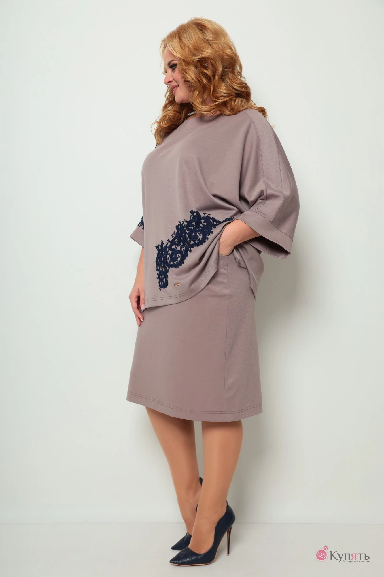 Нарядный, в то же время универсальный костюм выполнен из плотного трикотажа. Юбка садится по фигуре, ниже колена, есть карманы, пояс на резинке. Джемпер свободного прилегания, рукав цельнокроеный, по плечевому шву с одной стороны и снизу, украшен кружевом, к низу на манжете, не прилегающей к руке, по бокам два не глубоких разреза. Свободный по крою верх подчеркнёт Ваши достоинства и будет прекрасно смотреться не только само по себе, но и в дуэте с блузкой либо водолазкой.