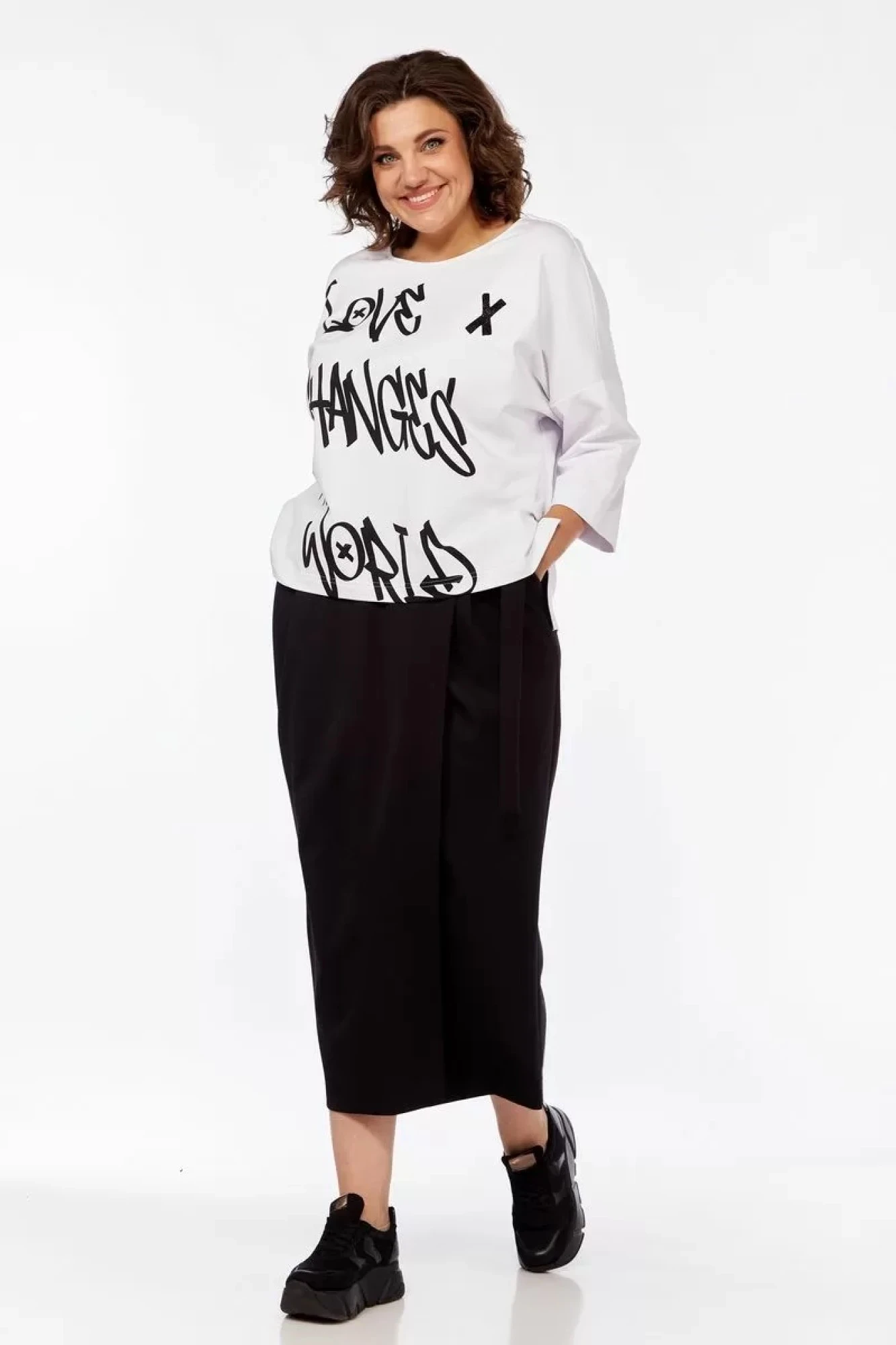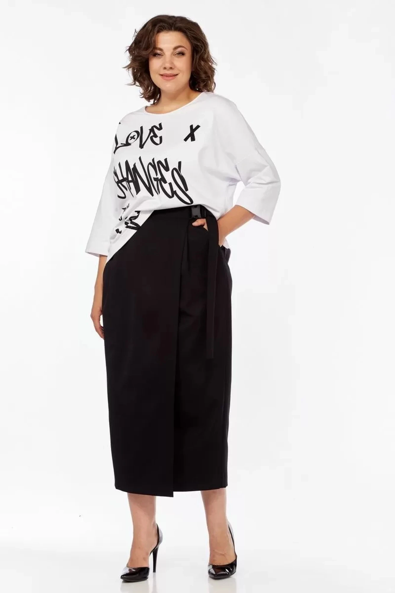Женский актуальный, базовый комплект для повседневной носки, состоящий из двух предметов: джемпера и юбки- макси. Джемпер свободного кроя из приятного на ощупь трикотажа, с круглой горловиной и рукавом 7/8, по переду в качестве декора модный принт из двух разных текстур( гладкой и с глиттером). Длинная юбка из ткани плательного - костюмного ассортимента, которая хорошо драпируется. Юбка на запах с отлитным поясом, из-под пояса складки, в боковых швах функциональные карманы. Оба изделия данного комплекта отлично сочетаются между собой и смело могут комбинироваться с другими вещами вашего гардероба.