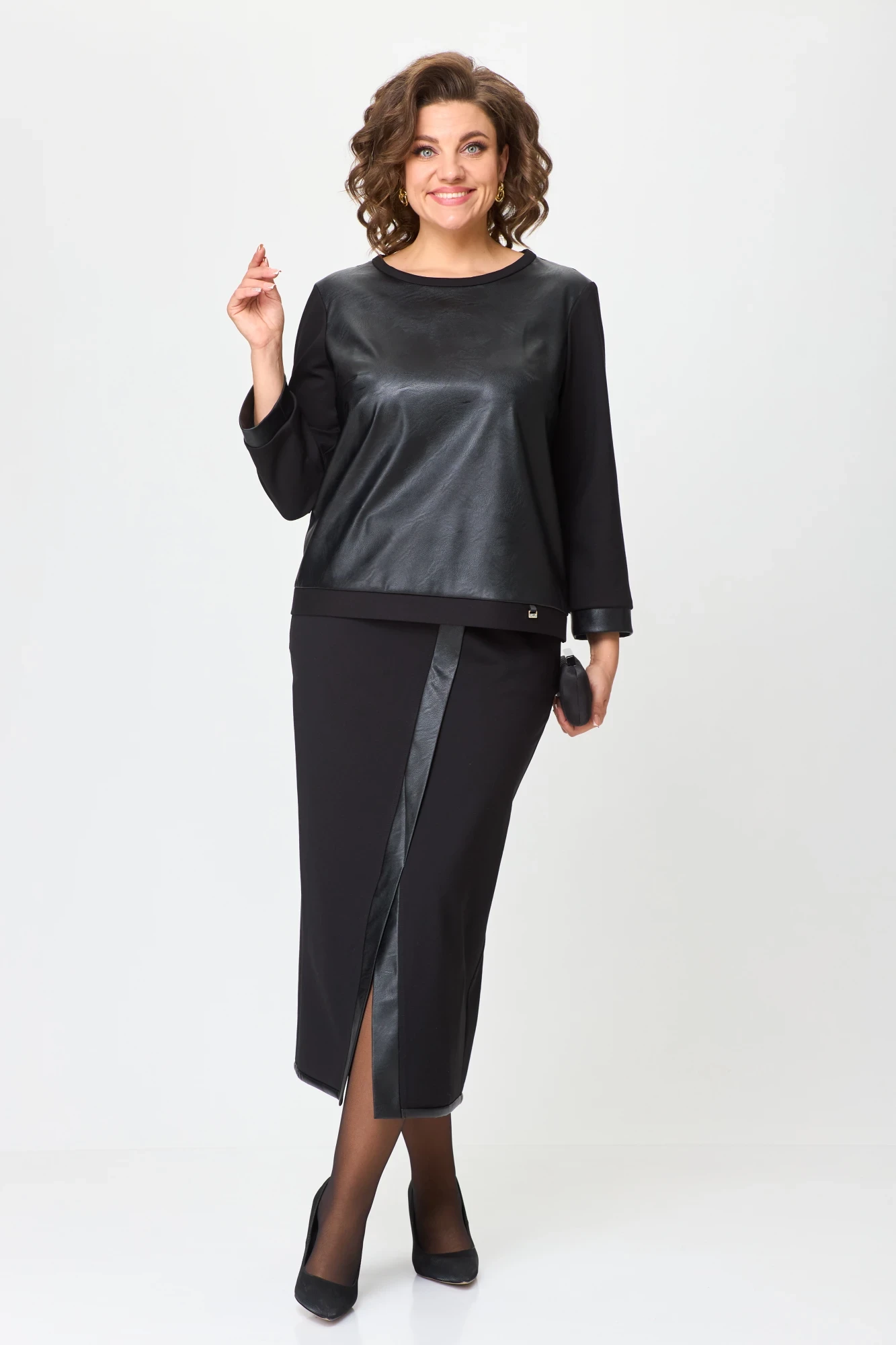 Универсальный и удобный женский юбочный комплект. Данный комплект отличный вариант для повседневной носки. Изделие состоит из джемпера и длинной юбки. Комплект выполнен из трикотажа с кожаной отделкой. Джемпер прямого полуприлегающего силуэта длиной до бедер, с круглым вырезом горловины. По переду эко кожа. Спинка джемпера выполнена из трикотажа; разрезная с застежкой на тесьму-молнию. Рукав длиной 3/4. Юбка прямая длиной макси с имитацией запаха по переду, задняя часть цельная. Юбка на притачном поясе с резинкой, в боковых швах карманы. С данным комплектом можно смело создавать стильные образы как вместе, так и по отдельности