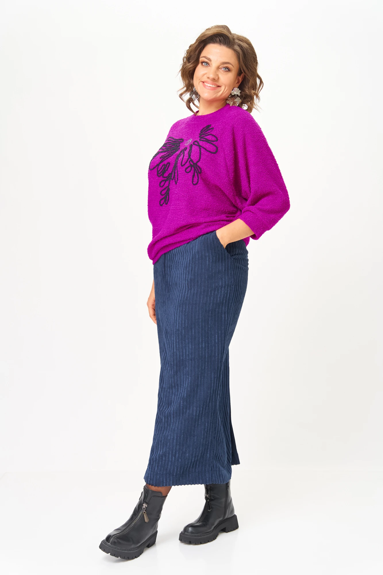 Этот элегантный и модный комплект станет ярким акцентом в вашем гардеробе! Комплект включает в себя яркий пурпурный джемпер с рукавами реглан «летучая мышь» и изящную юбку в темно-синих тонах, выполненную из мягкого, приятного к телу вельвета.