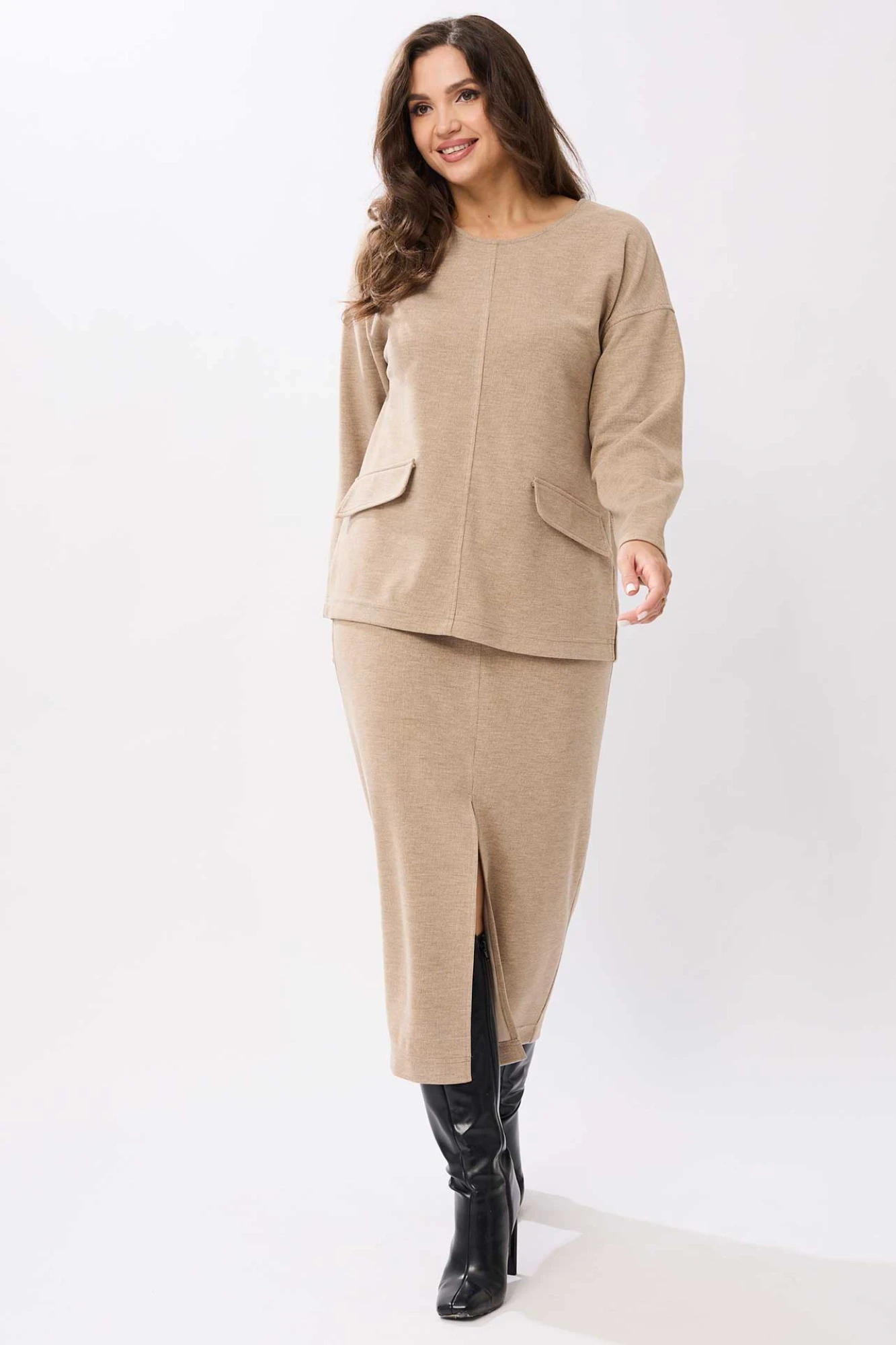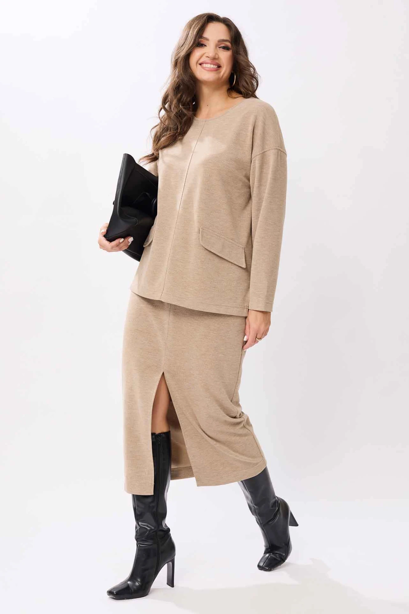 Костюм женский, состоящий блузы и юбки. Блуза прямого силуэта. Горловина круглая, обтачная,, спинка с центральным швом. Перед с центральным швом и настроченными клапанами. Рукава спущенные. Юбка зауженная к низу, на резинке и завязке. Перед со средним швом и разрезом. Юбка на подкладе.