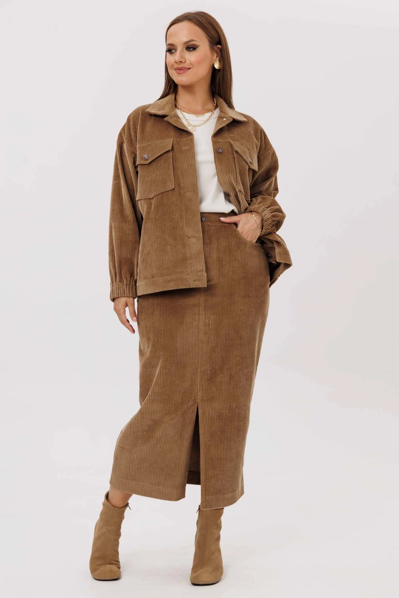 Комплект женский свободного силуэта состоит из бомбера и юбки. Бомбер со спущенными плечами застёгивается на прорезные петли и пуговицы. По переду прорезные карманы с широкой листочкой и накладные карманы с фигурными клапанами на застёжке. Воротник отложной. Рукава одношовные втачные на манжете. Юбка женская слегка зауженная к низу на притачном поясе со шлёвками, который застёгивается на прорезную петлю и пуговицу. По переду застёжка на молнию с гульфиком и откоском и карманы. По спинке центральный шов, заканчивающийся разрезом, кокетка и накладные карманы. Юбка и бомбер без подкладки.