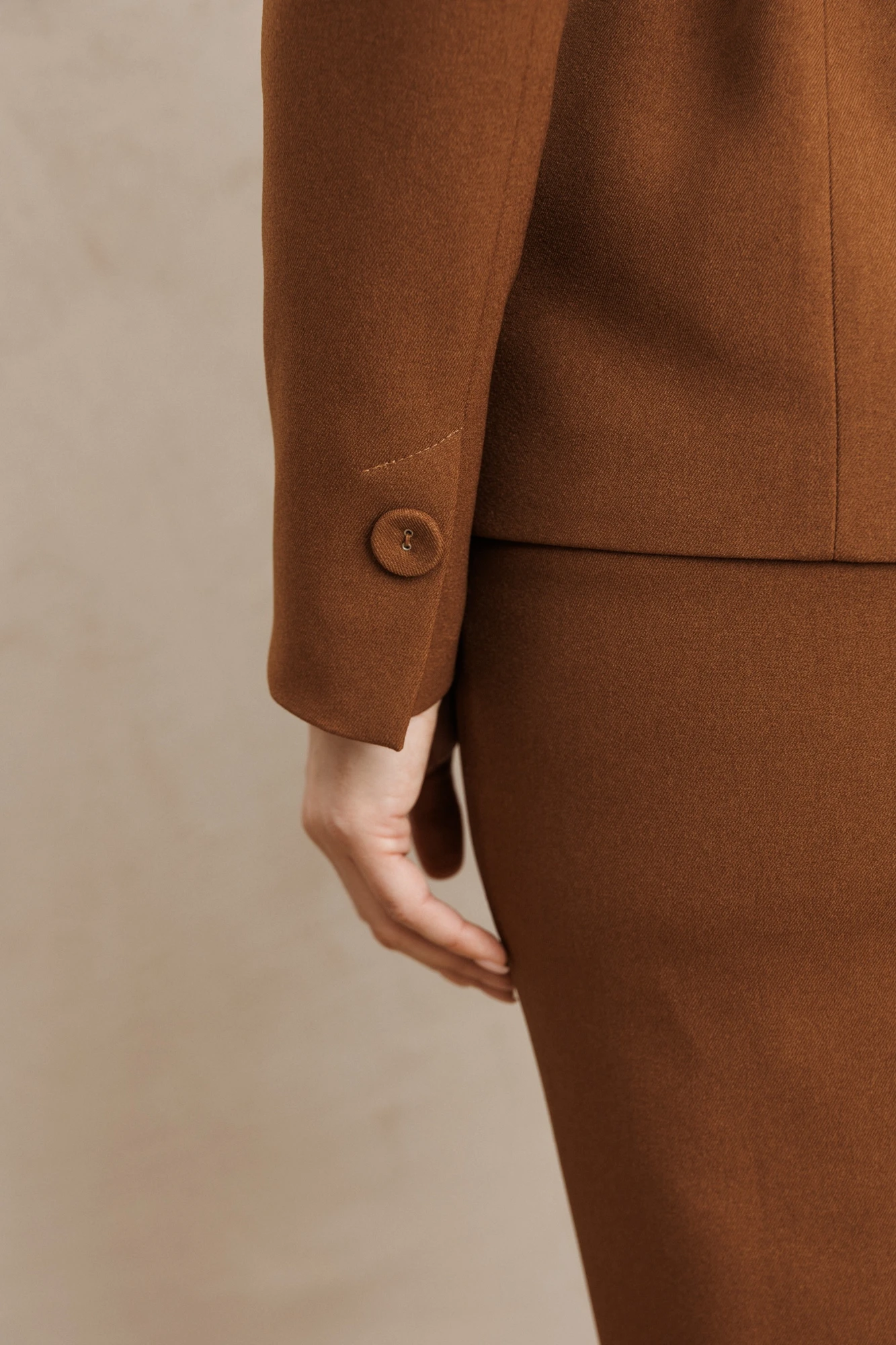 Костюм выполнен из качественной костюмной ткани, что придает изделию прочность и долговечность, а также создает элегантный и современный образ, подходящий для различных деловых мероприятий и повседневной носки.