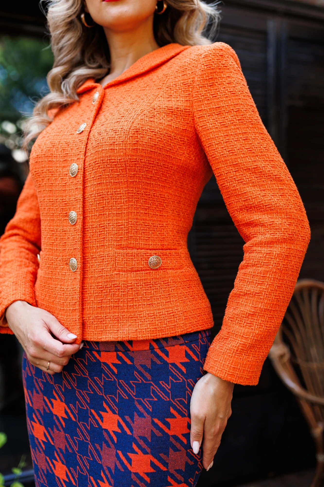 Костюм женский, состоящий из жакета и юбки. Жакет в стиле "шанель" из буклированного материала с центральной застежкой на петли-пуговицы. По переду вертикальные рельефы, бочки, крупные накладные карманы (в цвете василек), листочки, имитирующие карманы (в оранжевом цвете). Спинка со средним швом и рельефами. Воротник-шалька. Рукава втачные, двухшовные. Жакет на подкладке. Юбка зауженная к низу. Молния и шлица в среднем шве. Пояс на кокетках. Юбка на подкладке.