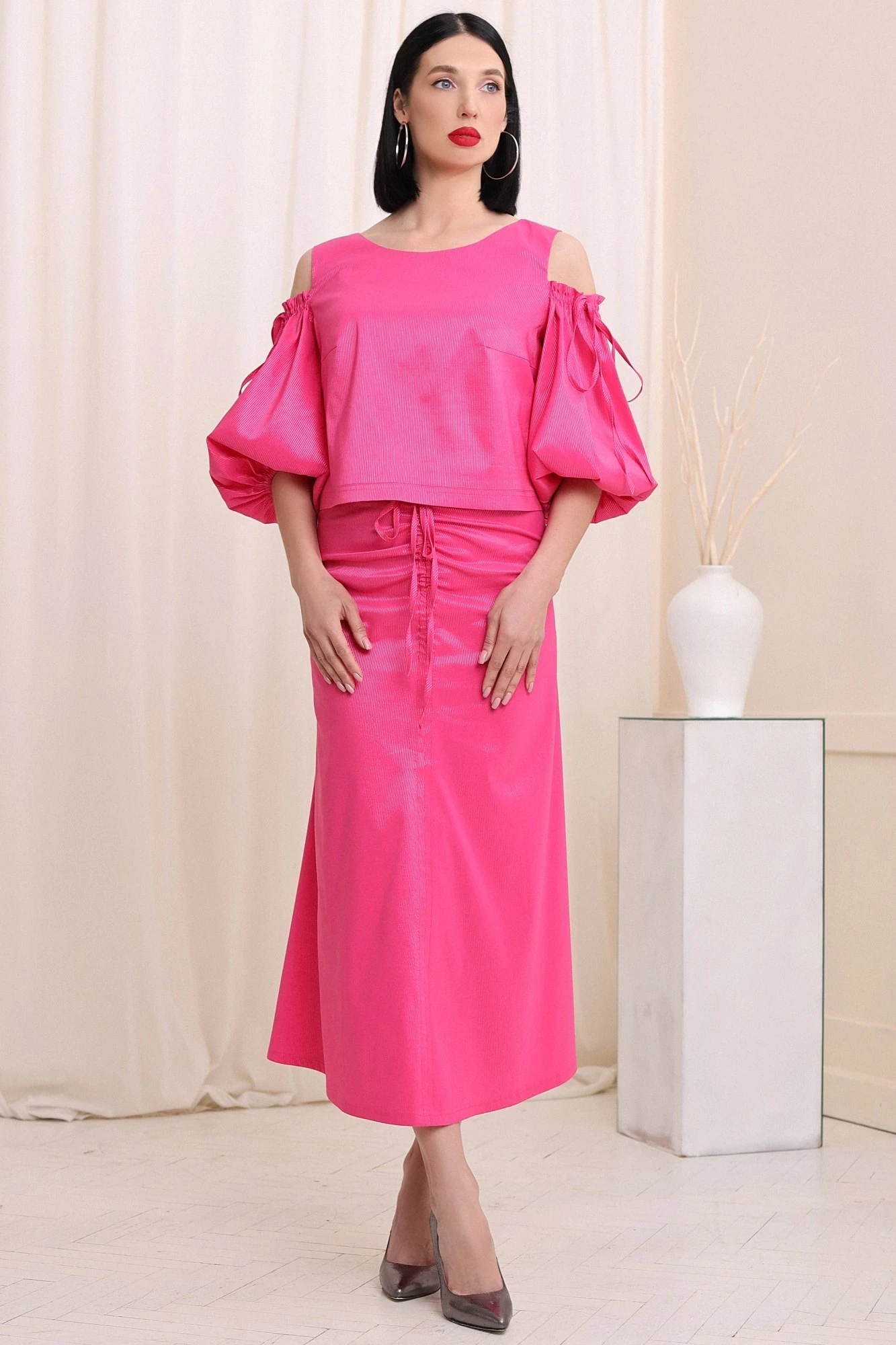 Мода на женственность возвращается. Этот костюм стал нашим фаворитом. Блуза прямого силуэта, по переду с нагрудными вытачками, по низу с притачной планкой, спинка со средним швом. Рукав расширенный, снизу на резинке, сверху с кулиской, что позволяет регулировать ширину. Блуза на подкладке. Юбка А-силуэта на притачном поясе, по бокам с резинкой. Застежка на тесьму молнию в среднем шве. Юбка на подкладке.