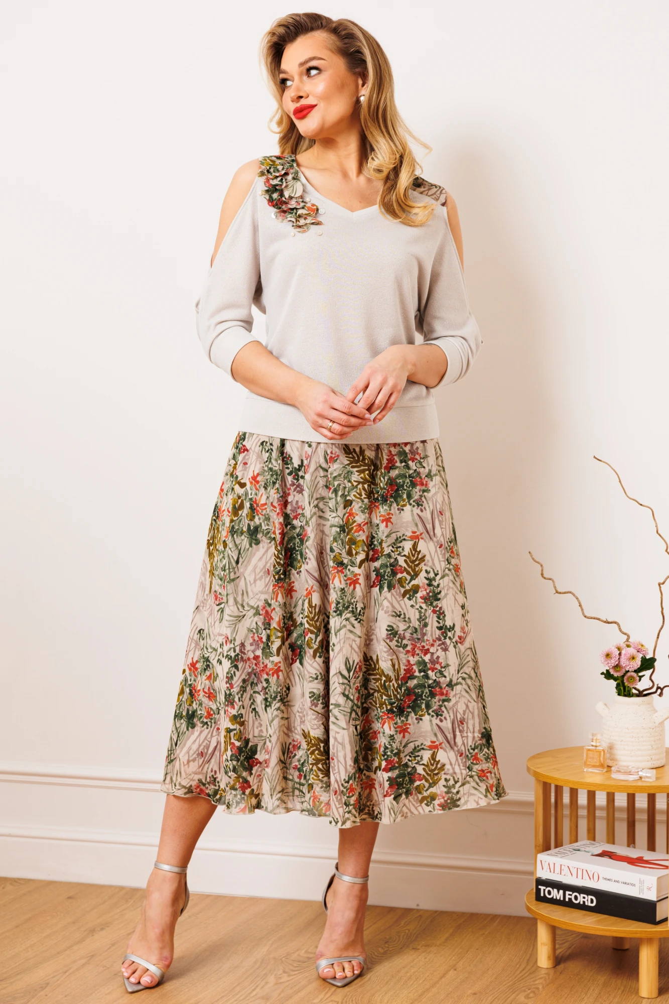 Шифоновая юбка в тандеме с блузоном. Блузон выполнен из трикотажного полотна. Перед и спинка с отрезными кокетками выполнеными из ткани юбки. Рукав цельнокройный с открытым плечом. Низ рукавов и низ блузона с притачной манжетой. Юбка полусолнце, сверху на притачном поясе с резинкой.