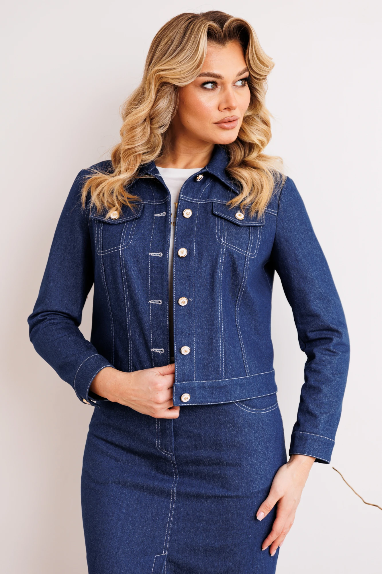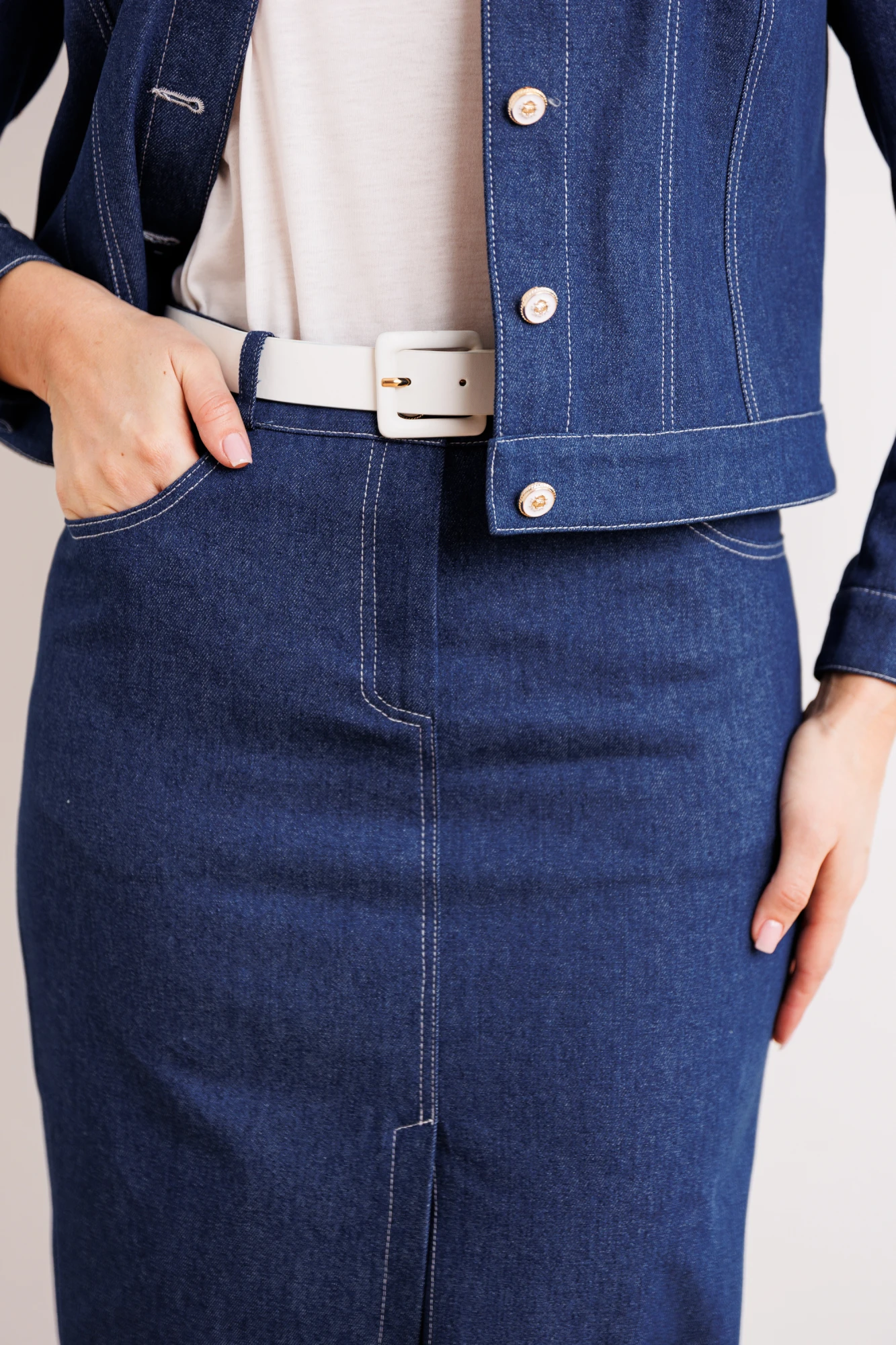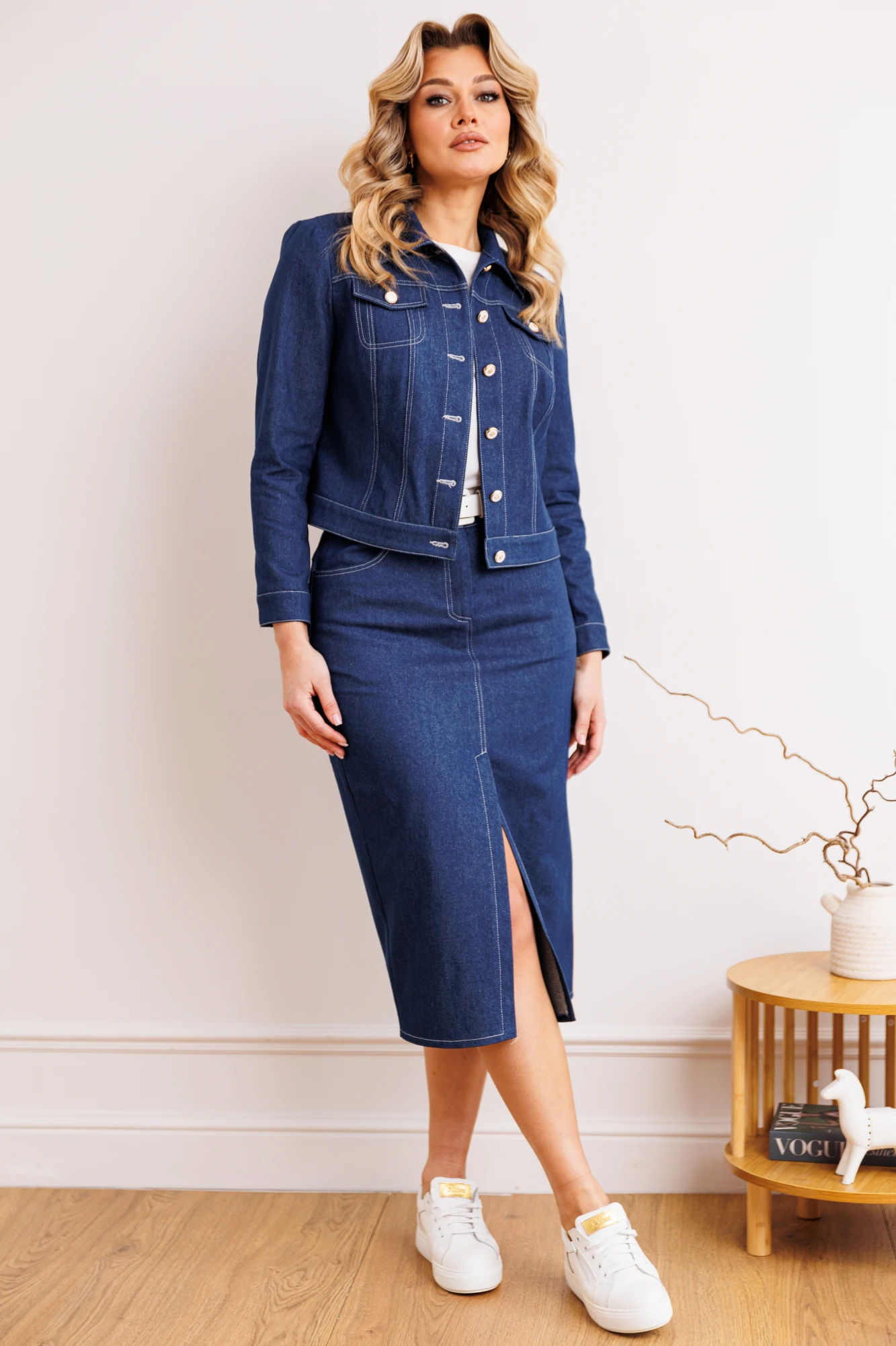 Комплект состоит из куртки и юбки, выполненных из джинсового полотна. Джинсовая юбка миди - это не только модно, но и удобно. Она сочетает в себе стиль и комфорт, подходит для различных ситуаций и выглядит прекрасно на любой фигуре. Мы предлагаем прямую юбку-карандаш с разрезом. Разрез вносит шарм, романтичность и добавляет нотку эротичности женскому образу. Карманы придают спортивность. На задней половинке юбки - кокетка и средний шов. Застежка спереди на молнию. Верхний срез юбки обработан притачным поясом. К юбке прилагается ремень. Куртка полуприлегающего силуэта. Полочка с отрезной кокеткой, рельефными швами от кокетки до низа куртки. Спинка с отрезной кокеткой и рельефными швами. По низу куртки идет притачная планка, которая на боковых швах украшена настрочными патами. Рукав втачной, двухшовный. Застежка центральная на петли-пуговицы. Рельефы кокетки, клапаны и воротник отстрочены двойной отделочной строчкой.