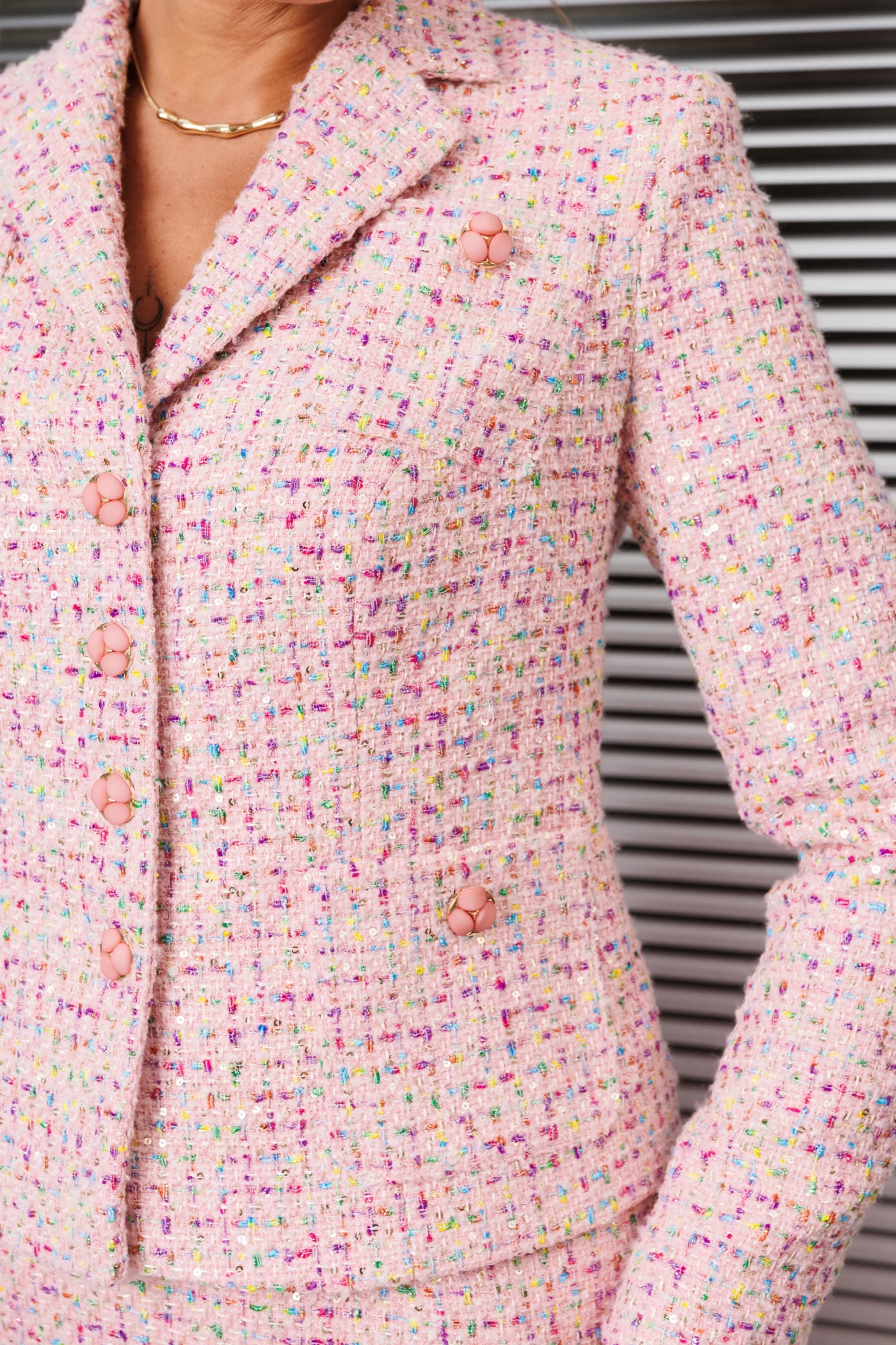 Твидовый костюм - нестареющая классика. Традиционно он олицетворяет респектабельность и безупречность. Представленный костюм состоит из укороченного жакета и юбки. Жакет полуприлегающего силуэта с центральной застежкой на петли-пуговицы. Спинка со средним швом и талиевыми вытачками. По переду нагрудные вытачки и накладные карманы. Воротник пиджачного типа. Рукава втачные, двухшовные. Локтевой шов оформлен отлетной шлицей с пуговицей. Юбка зауженная к низу с завышенной талией. Молния в среднем шве. По переду декоративная шлица и накладные карманы. По центру переднего полотнища юбки ряд декоративных пуговиц. Костюм на подкладке.