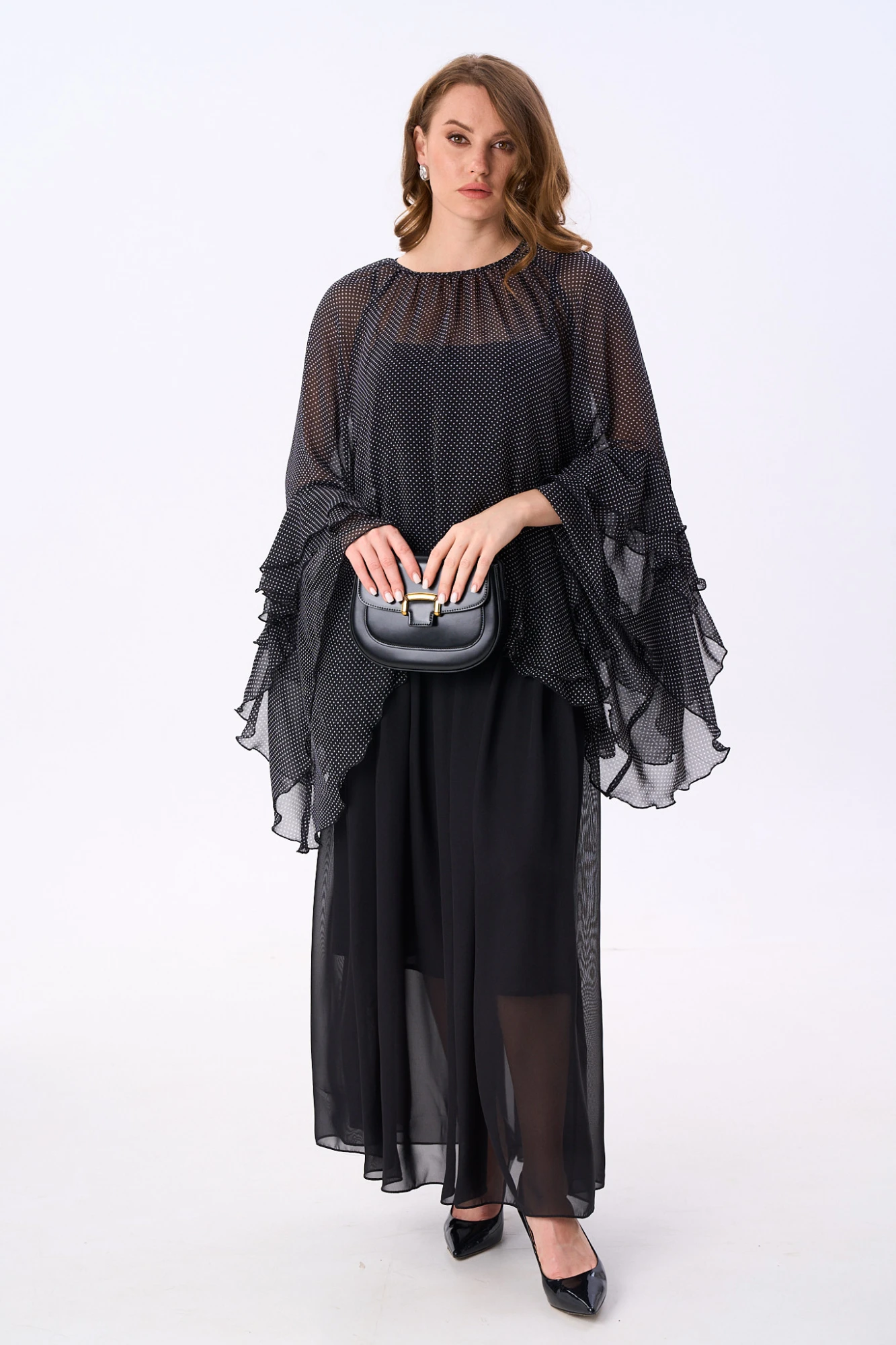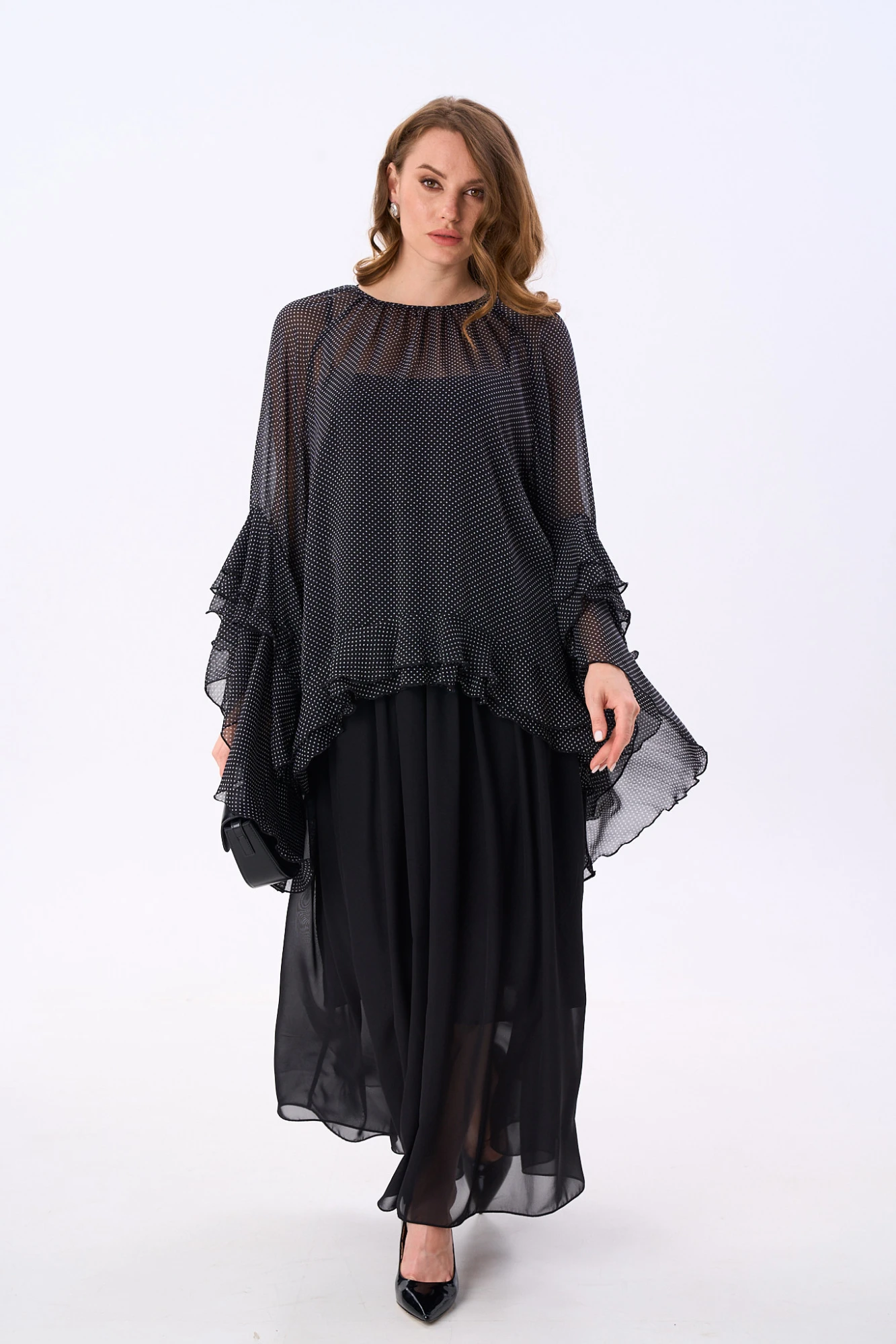 Костюм трехпредметный: состоит из блузы, юбки и комбинации. Блуза свободного силуэта с присборенной горловиной, обработанной бейкой. Спинка со средним швом, переходящим в разрез. Рукава реглан с асимметричными воланами. Юбка макси расширенного силуэта на резинке. Нижний край блузы с двойным воланом. Нижнее платье комбинация на регулируемых бретелях.