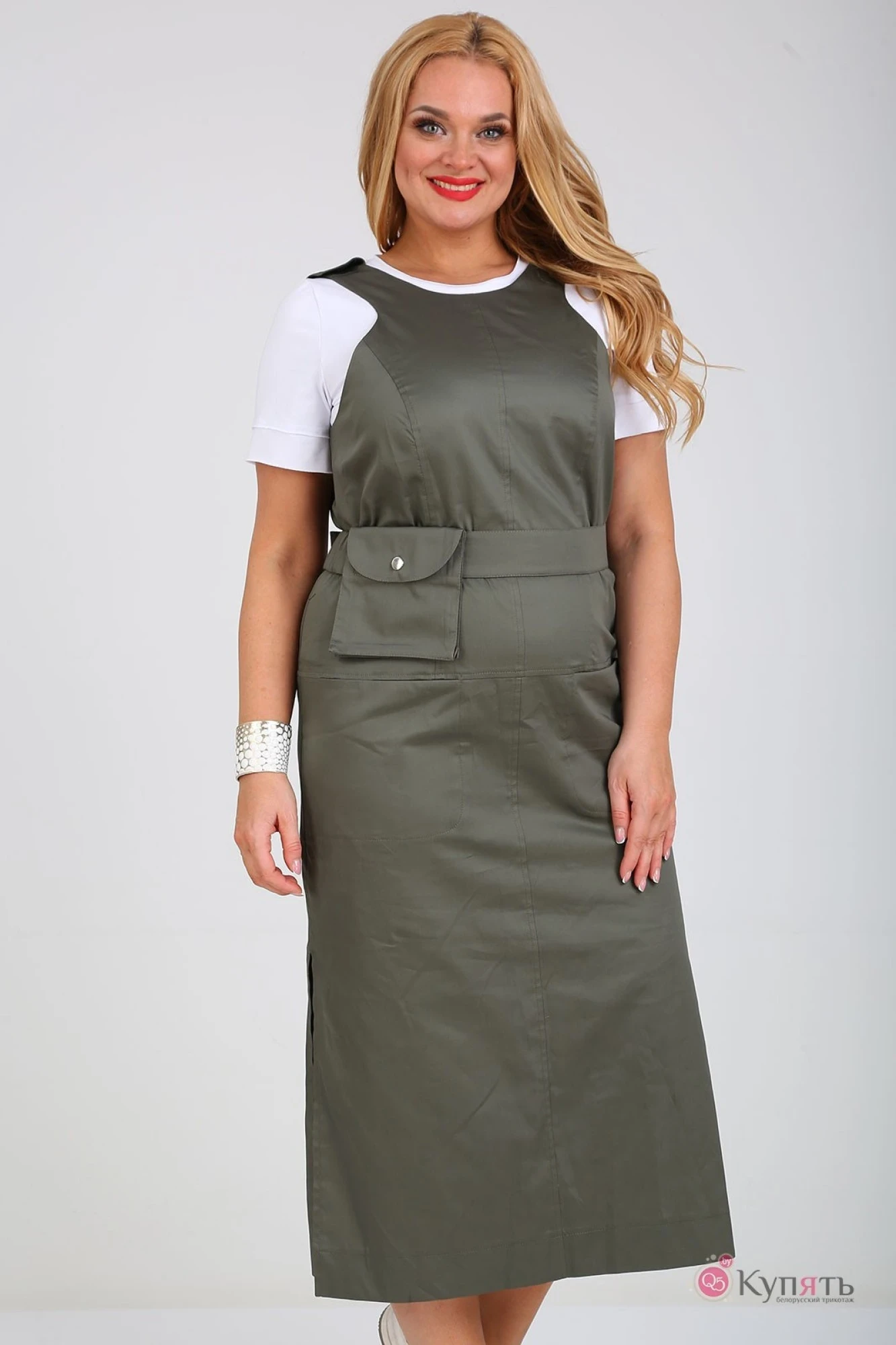 Комплект из сарафана и футболки. Сарафан полуприлегающего силуэта, выполнен из гладкокрашеного хлопкового сатина с небольшим добавлением эластана. Горловина и пройма рукава фигурные, округлые. Рельефы вертикальные из проймы до горизонтального подреза ниже линии талии. Карманы по переду и спинке в горизонтальном шве. По центру переда и спинки - шов с отделочной строчкой. Вырез по спине глубокий, V – образный с лацканами. В комплекте - съёмный пояс из основной ткани, на кнопках, со съёмной мини-сумочкой. Разрезы в боковых швах.