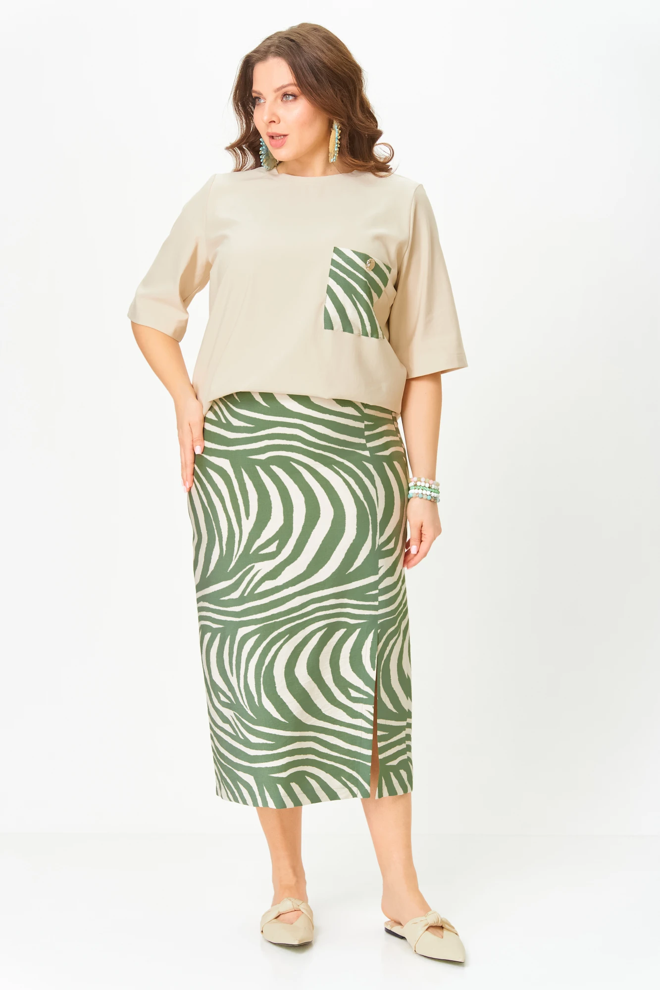 Стильный, комфортный комплект двойка из футболки и юбки с разрезом с рисунком «Зебра». Футболка из кулирной глади премиального качества с добавлением эластана обеспечивает мягкость, воздухопроницаемость и идеальную посадку по фигуре. Плотная, но дышащая ткань сохраняет форму даже после множества стирок, а эластичные волокна гарантируют свободу движений без деформации.На полочке карман из контрастной ткани и отделочная позолоченная пуговица. Юбка из текстиля, с разрезом на ноге. Пояс юбки на резинке. Легкие стрейчевые ткани комплекта очень комфортны для жаркого лета. Функциональные части комплекта хорошо сочетаются с другими элементами гардероба.