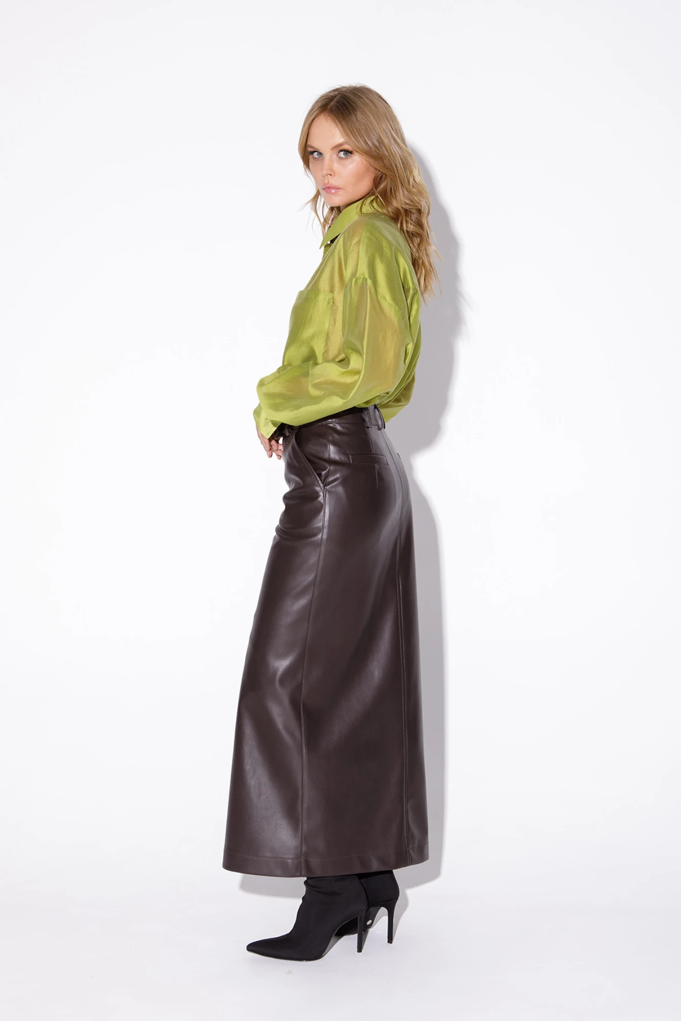 Костюм-двойка из укороченного оверсайз жакета с расширенной линией плеч и прямой макси-юбки с высоким разрезом из экокожи. Детали: прямой силуэт, спущенная линия плеча, пиджачный воротник, перед с функциональным нагрудным карманом, застежка двубортная на петли и пуговицы, рукава втачные двухшовные, жакет на подкладке. Юбка на притачном поясе со шлевками, талиевые вытачки, боковые карманы, застежка на потайную молнию, на подкладке. Длина жакета по спинке около 47 см в размерах 40-46 и около 49 см в размерах 48-52, длина рукава около 60 см. Длина юбки по боковому шву с поясом около 95 см в размерах 40-52 см