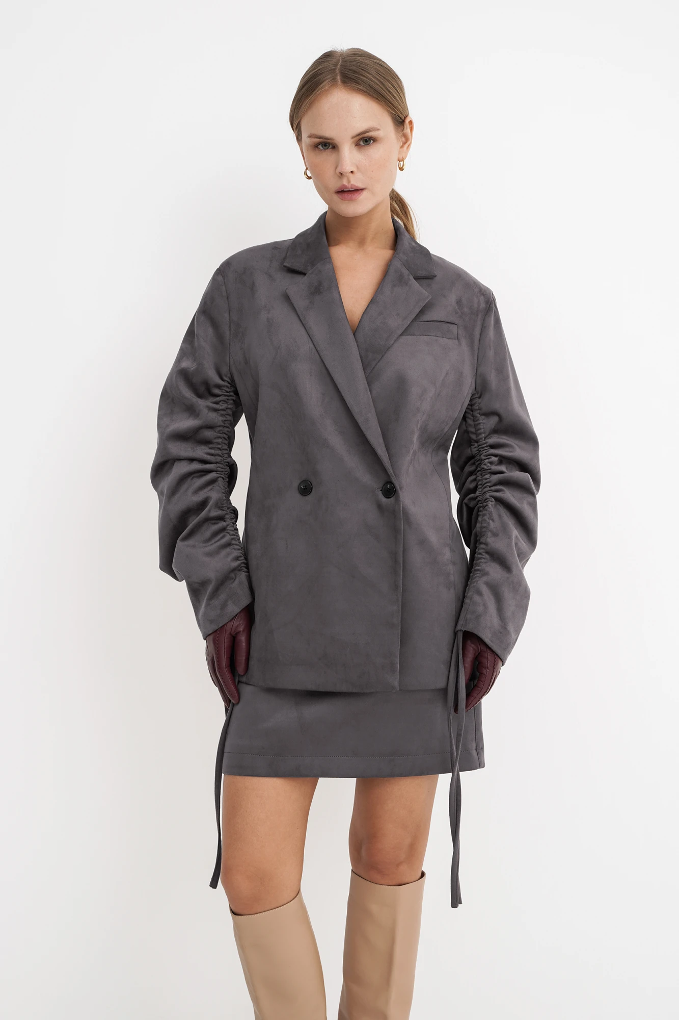 Костюм-двойка из свободного жакета и мини-юбки из замшевой ткани. Детали: жакет свободного покроя, прямой силуэт, двубортная застежка на петли и пуговицы, пиджачный воротник, функциональные карманы, рукава длинные с регулируемой кулисой, жакет на подкладке, съемный пояс. Юбка трапециевидного силуэта, талиевые вытачки, потайная застежка, юбка на подкладке. Длина жакета по спинке около 69 см в размерах 40-46 и около 72 см в размерах 48-52, длина рукавов около 62 см. Длина юбки по боковому шву около 43 см в размерах 40-46 и около 46 см в размерах 48-52.