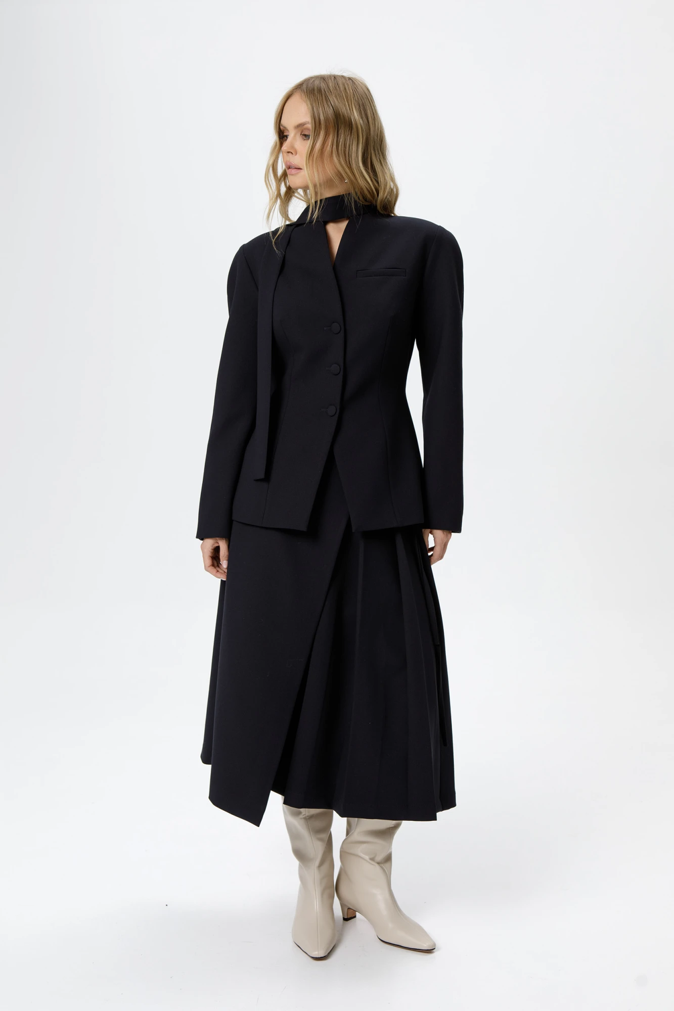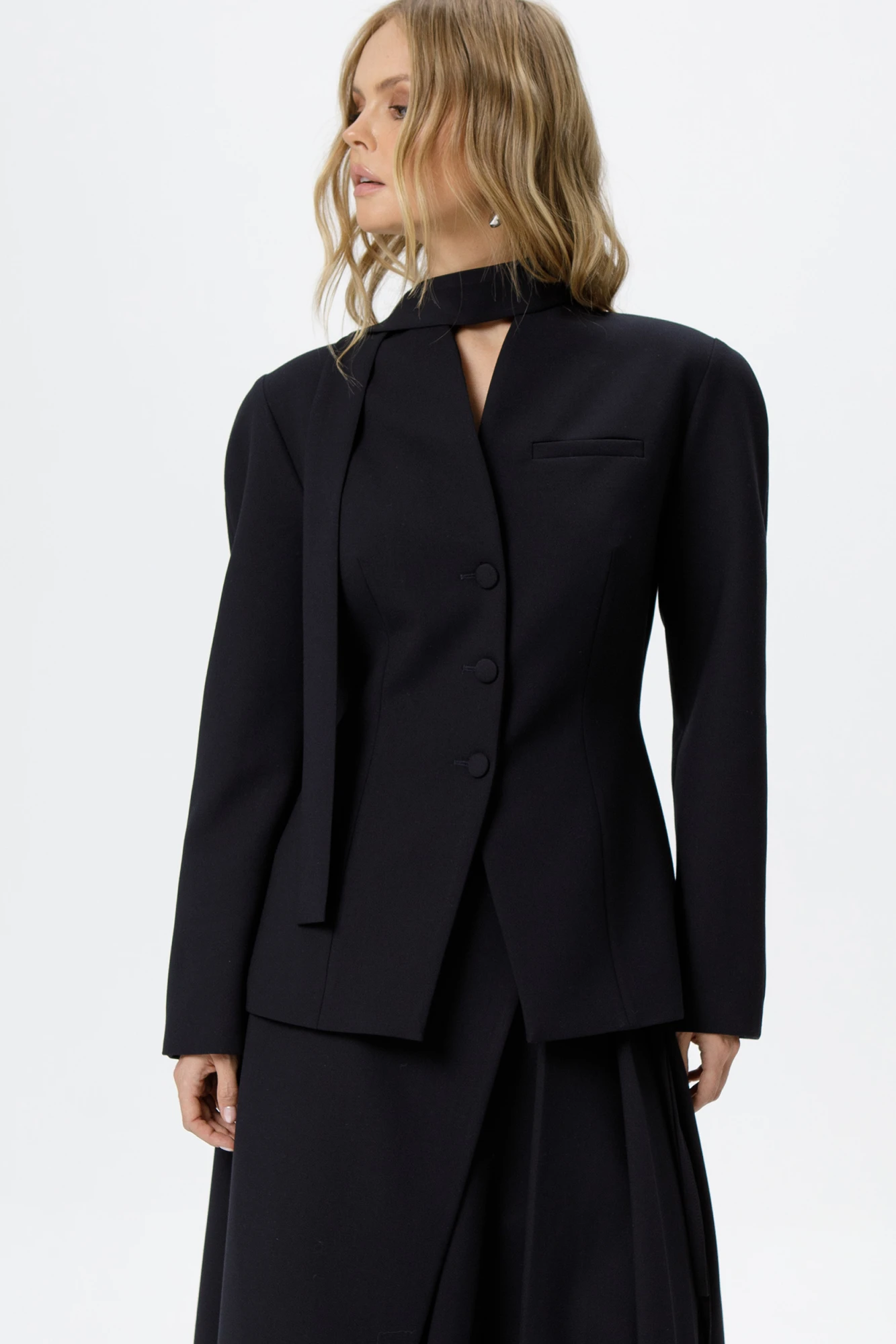 Костюм-двойка из приталенного жакета с акцентными плечами и асимметричной юбки со складками.