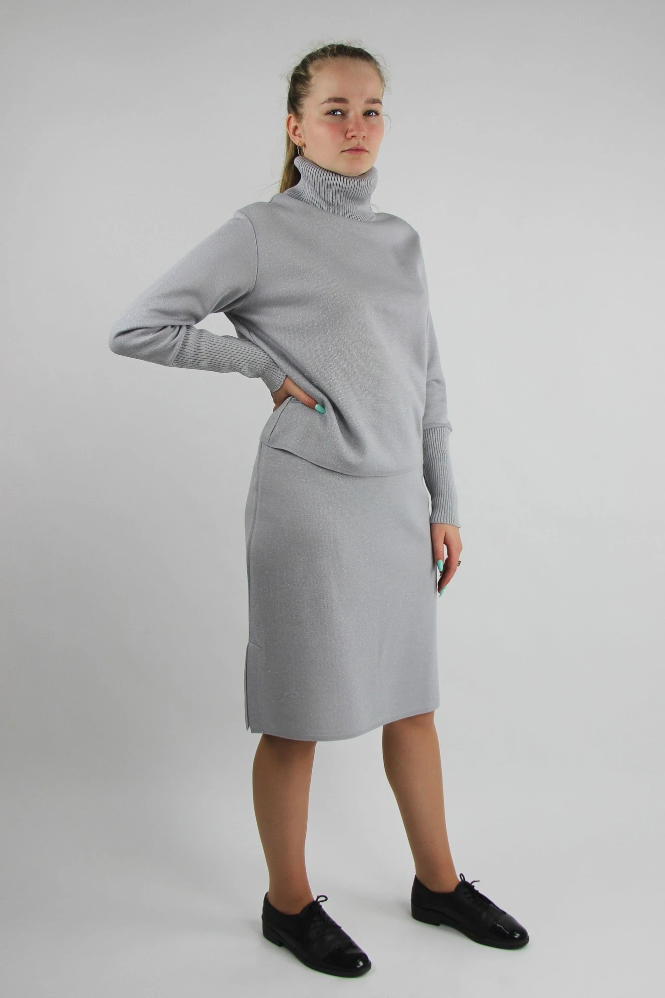 Комплект второго слоя. Состоит из свитера и юбки. Свитер укороченный прямого силуэта с длинным втачным рукавом с притачными ластичными манжетами, круглым вырезом горловины, обработанным отложным воротником. Низ стана заработан сдв. кул . гладью 1+-0,3 см. Юбка прямого силуэта с разрезами по бокам.На задней детали юбки талевые вытачки. Верхний срез обработан эластичной резиновой тесьмой шириной 4см. Низ юбки зарабан сдвоенной кулирной гладью 1,0см+0,2см.