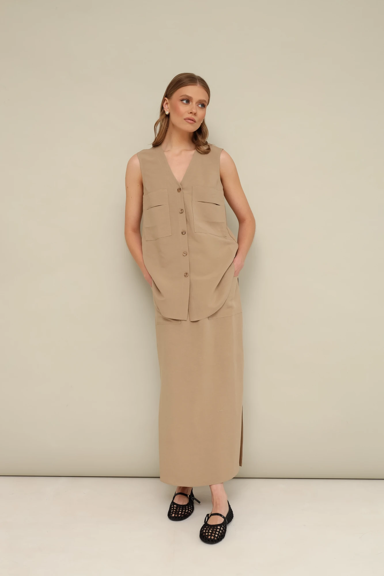 Летний 2-х предметный комплект в расслабленном стиле, состоящий из блузки и юбки. Блузка прямого силуэта с V-образным вырезом горловины, центральная застежка на петли и пуговицы. По спинке отрезная кокетка. Фигурный низ, в боковых швах разрезы. Юбка прямого силуэта с притачным поясом на резинке с завязками. По переду блузки и юбки обработаны накладные карманы. В боковых швах юбки - высокие разрезы.