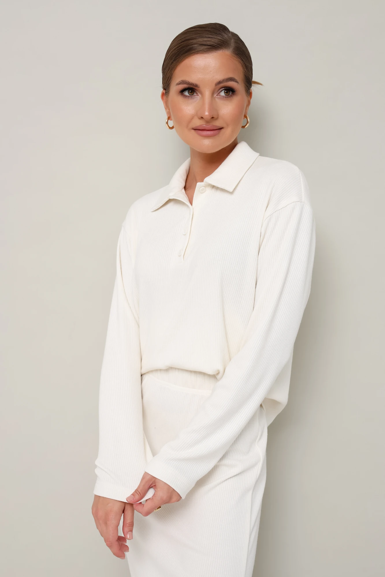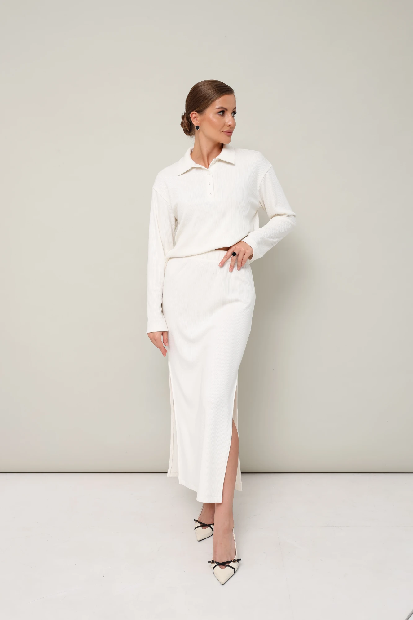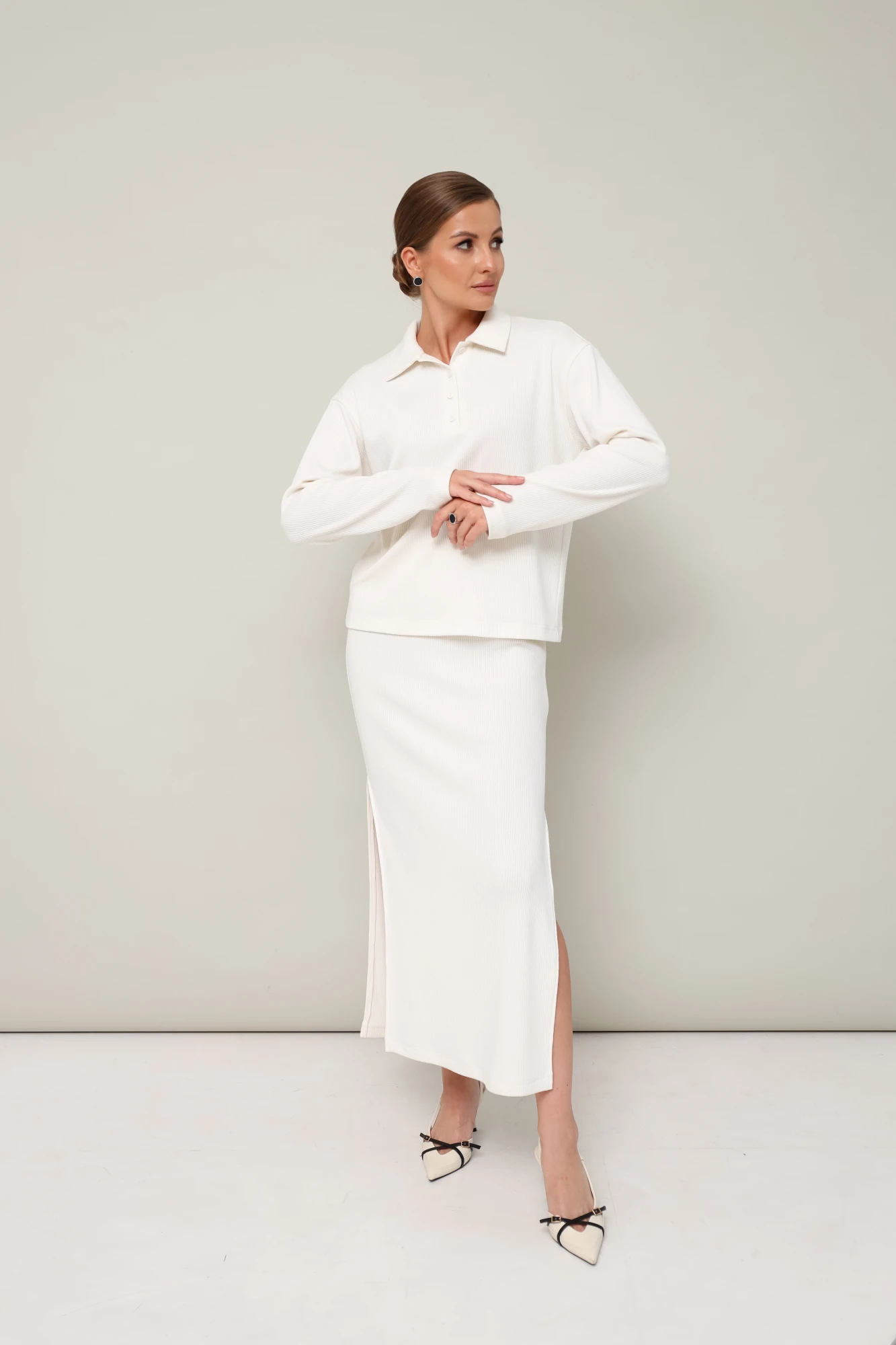 Комфортный трикотажный комплект, состоящий из поло и юбки. Поло с отложным воротником с цельнокроеной стойкой. Вырез горловины обработан притачными планками с застежкой на петли и пуговицы. Спущенная линия втачивания рукава. Юбка прямого кроя, пояс на резинке, в боковых швах обработаны высокие разрезы.