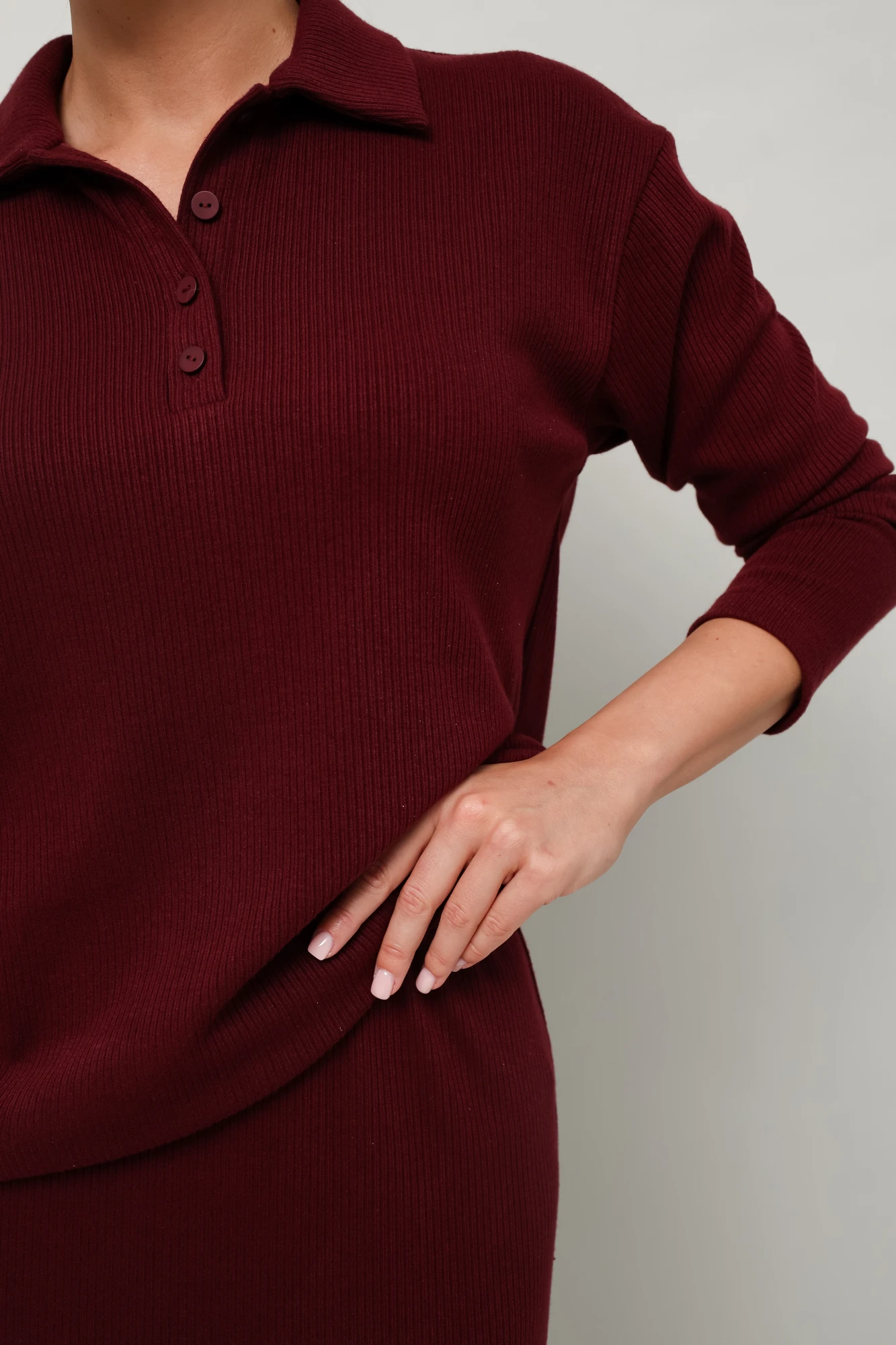 Комфортный трикотажный комплект, состоящий из поло и юбки. Поло с отложным воротником с цельнокроеной стойкой. Вырез горловины обработан притачными планками с застежкой на петли и пуговицы. Спущенная линия втачивания рукава. Юбка прямого кроя, пояс на резинке, в боковых швах обработаны высокие разрезы.