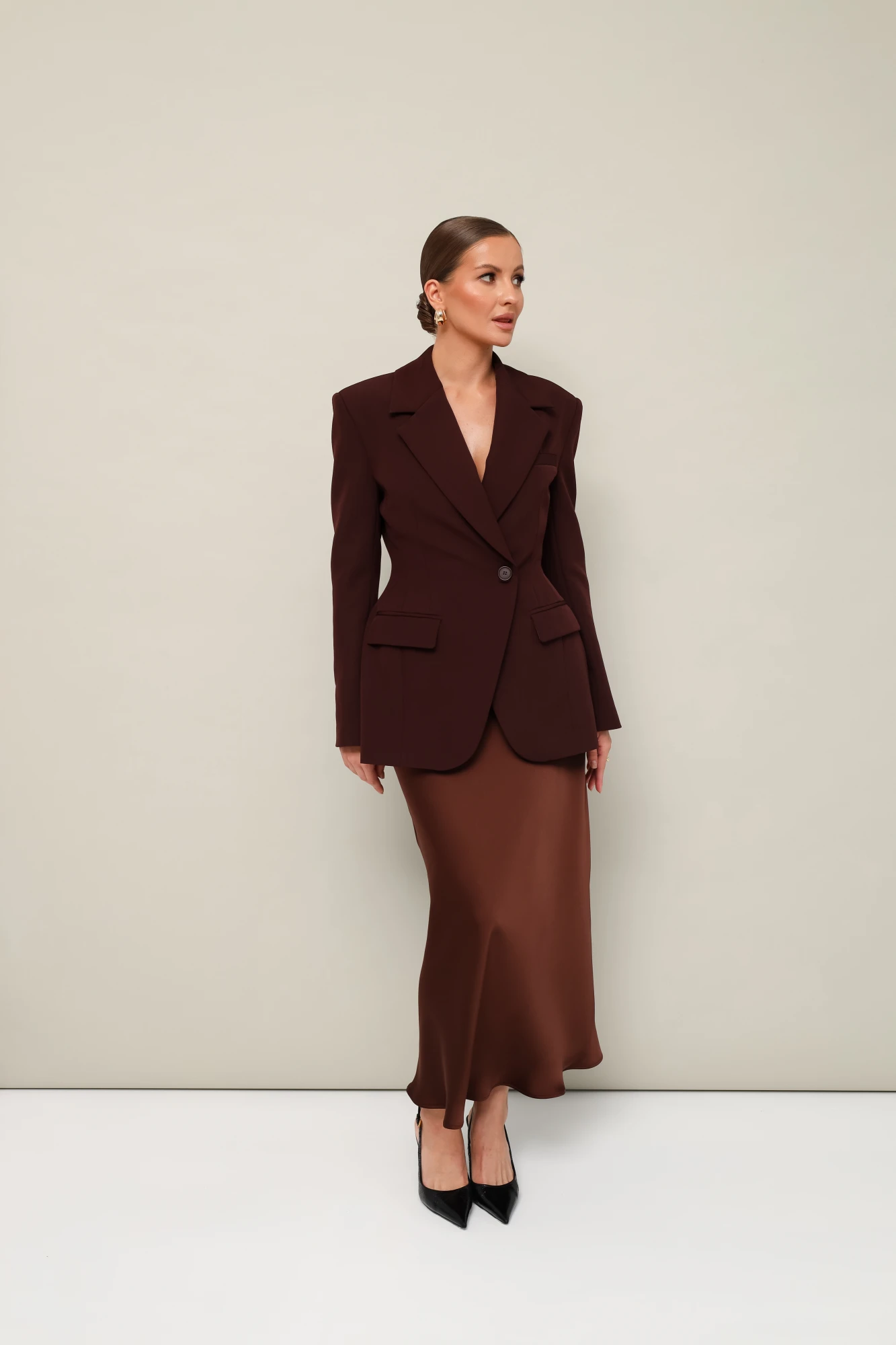 Юбка с кроем «по косой» в длине миди, пояс на обтачке, застежка в боковом шве на потайную тесьму молнию."