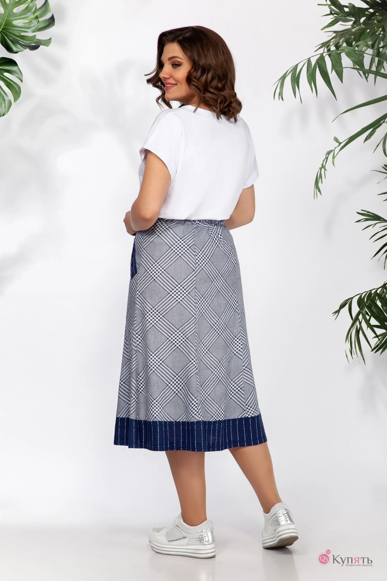 Костюм женский юбочный, состоящий из натуральной хлобчатобумажной ткани двух расцветок. Топ из трикотажа, прямого силуэта со спущенным​ плечом. Юбка расклешённая,​ состоящая из шести клиньев.​ В юбке двубортная застёжка на 8 петель и пуговиц. По верху юбки обработан ассиметричный декоративный пояс, застёгивающийся на пряжку "полукольца". По переду на боковых клиньях​ настрочены декоративные клапаны с пуговицами. По низу юбки выполнен подрез. По спинке в области талии обработана резинка.
