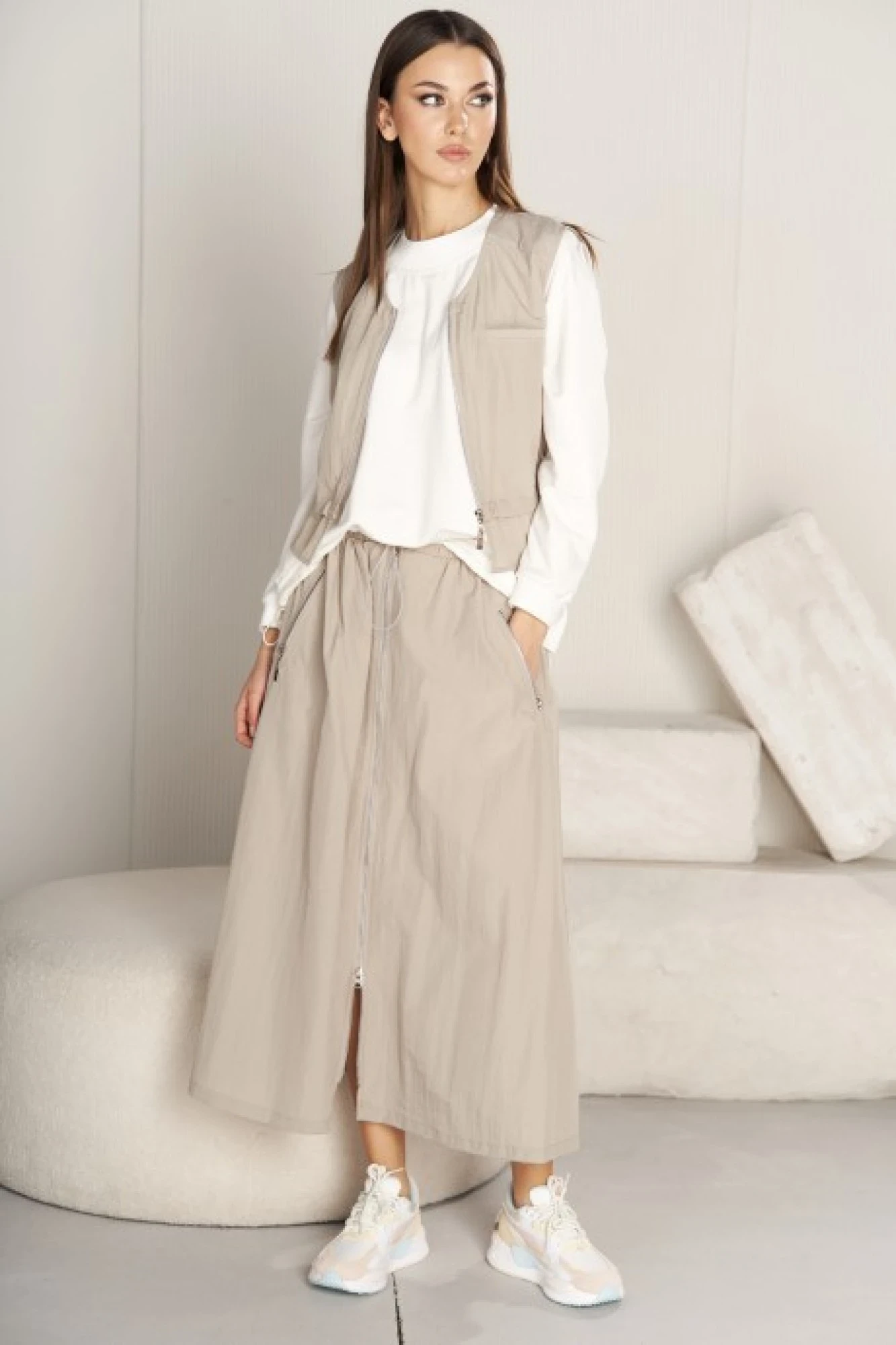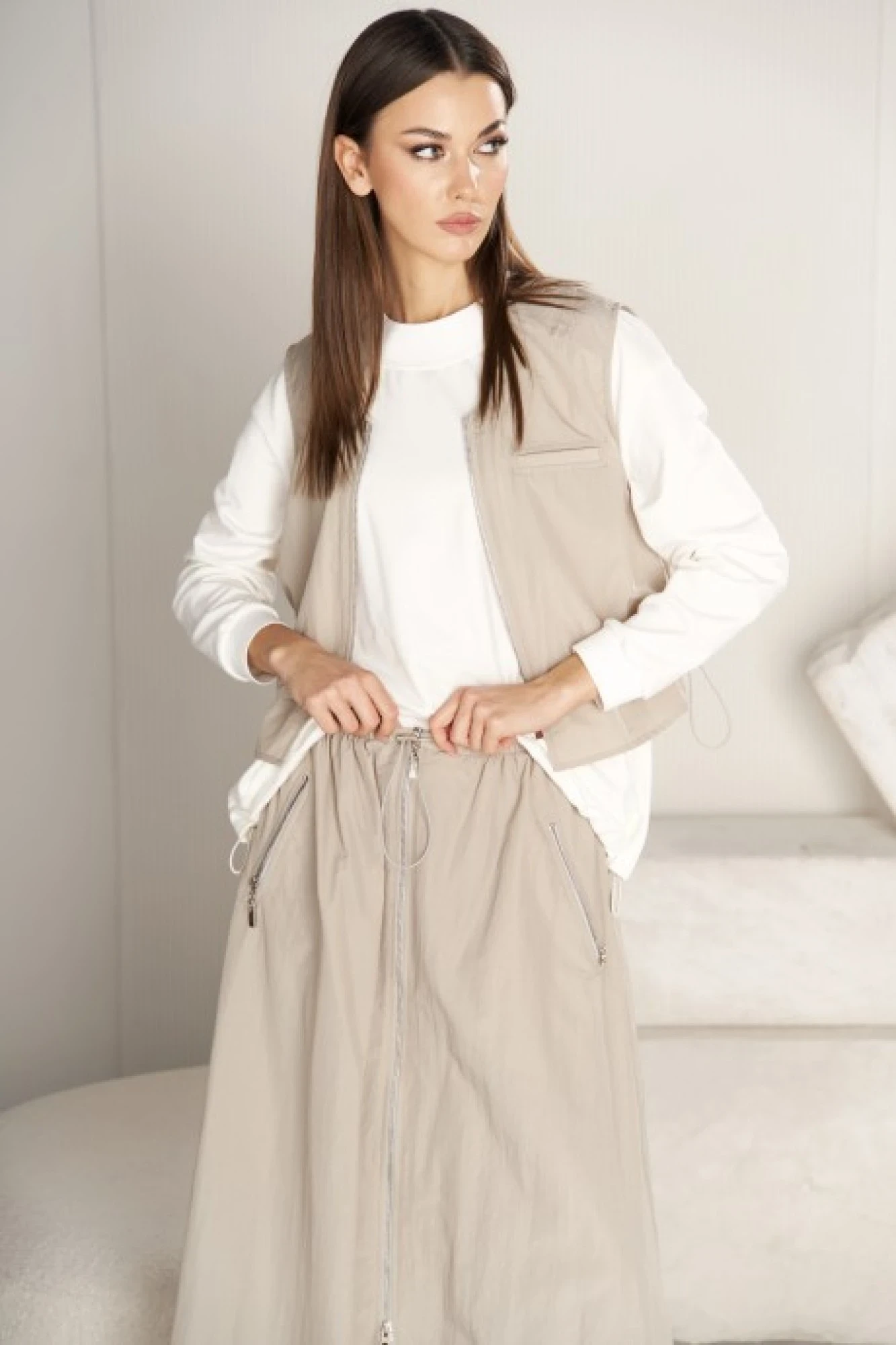 Жилет свободный с центральной застёжкой на тесьму-молнию, кулисой чуть ниже линии талии, неширокой баской. Полочки с отрезной кокеткой и прорезным карманом с листочкой. Кулиса с эластичным шнуром и фиксаторами.