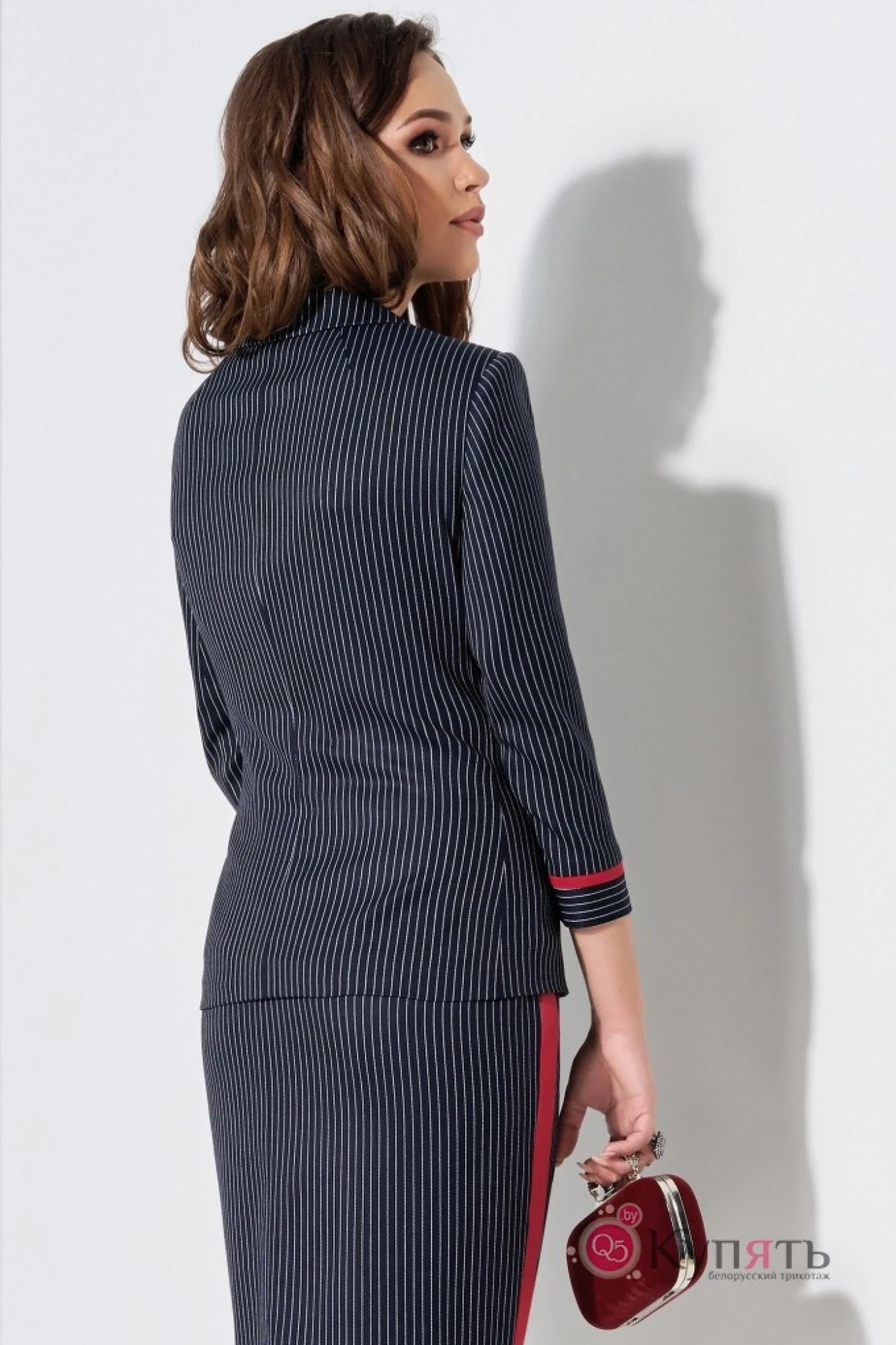 Современный костюм в стиле «casual», с классическим воротником пиджачного типа. Маленький дизайнерский штрих стильные пуговицы и красная отделка , завершает весь образ стильная съемная брошь . Жакет полуприлегающего силуэта с горизонтальными карманами в рамку с двумя обтачками и клапанами (карманы функциональные). Спинка со средним швом и отрезными бочками. Рукава втачные свободные с отрезными манжетами и плоским кантом из красного однотона. Юбка карандаш с отрезным поясом, по бокам вставлены узкие лампасы из однотонна, низ оформлен отрезной узкой деталью. Застежка на потайную молнию в среднем шве спинки. Жакет и юбка на подкладке.