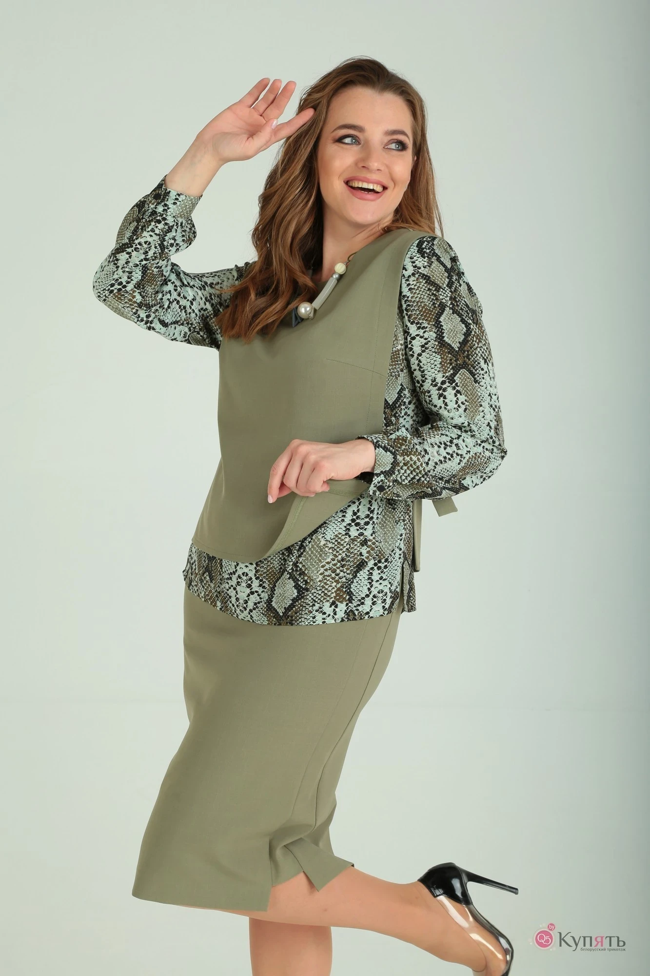 Комплект женский двухпредметный. Блуза свободного силуэта их шифоновой ткани с имитацией жилетки из отделочной ткани. По бокам хлястики с пряжкой, позволяющие регулировать прилегание по линии талии. Горловина округлая. Рукав длинный одношовный, втачной. Юбка прямая. Верх переда и спинки на кокетке. По спинке два декоративных кармана и шлица. Юбка на подкладке. Комплект дополняется съемным украшением.Длина рукава 60 см, длина блузы 62, Длина юбки 64 см