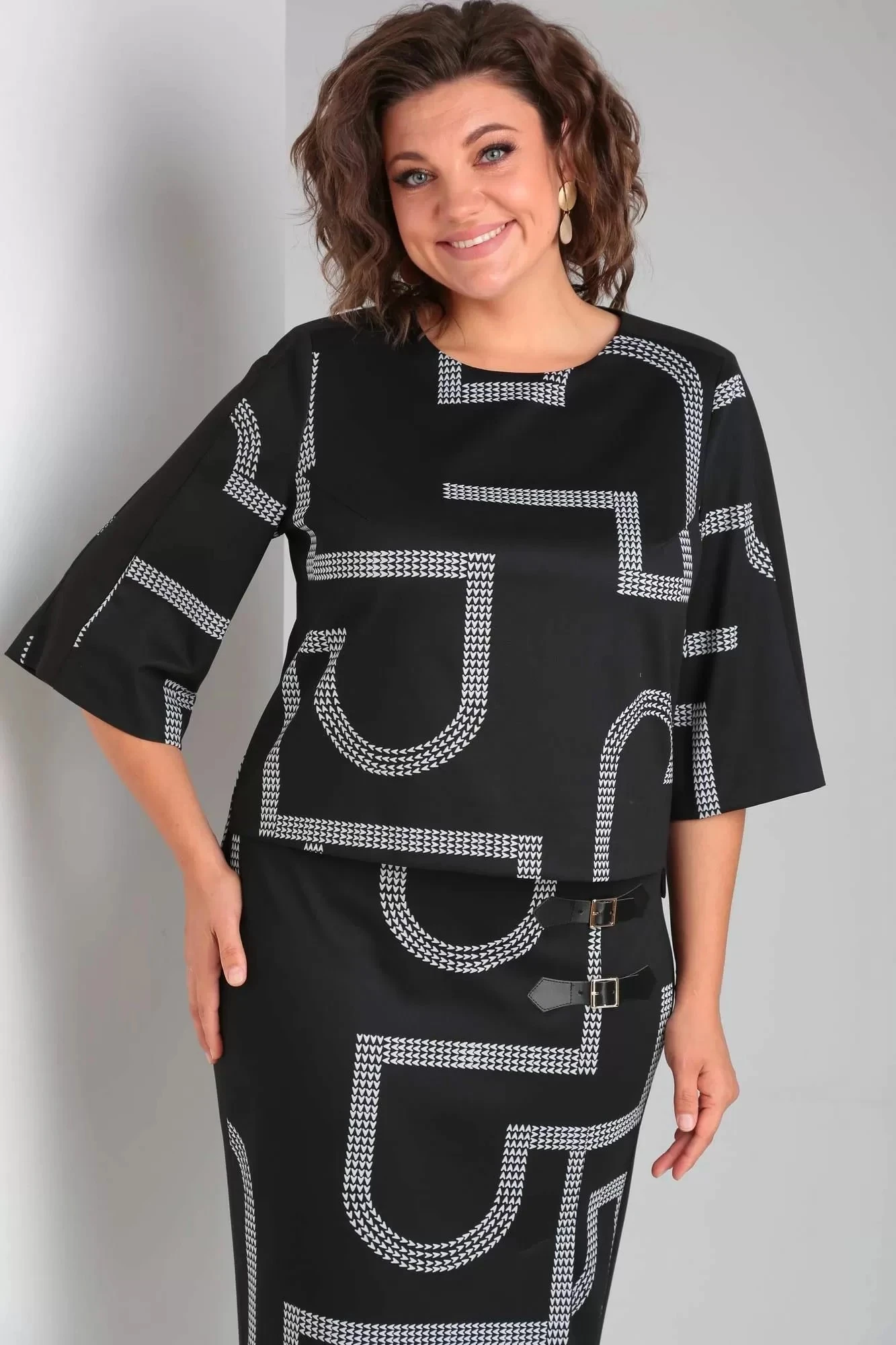Костюм женский юбочный из трикотажного полотна с принтом. Блуза прямого силуэта с нагрудными выточками. Горловина округлая с застежкой на петлю-пуговицу по спинке. Рукав одношовный с лампасом из экокожи по центру рукава входящий в плечо и горловину. Юбка прямая на поясе с резинкой. По переду в левом рельефе шлица. Верх рельефа юбки украшен клевантами. В боковых швах лампасы из экокожи. Спинка юбки прямая с выточками