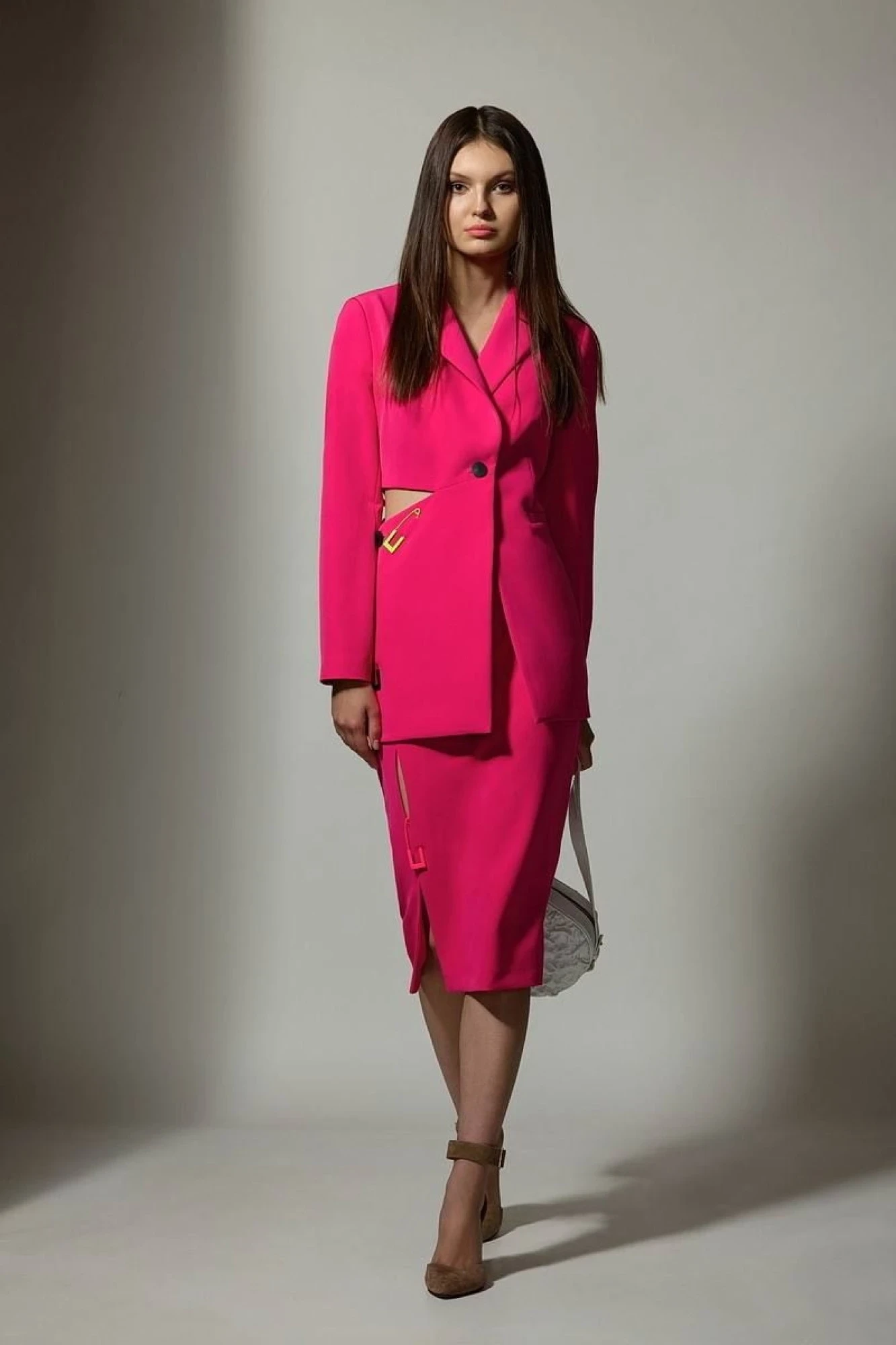 Комплект из костюмной ткани на подкладке, состоящий из жакета и юбки. Жакет приталенного силуэта. Верхняя часть переда с рельефами, вытачками. В левой части переда - прорезной карман в рамку. В правой нижней части переда отлетная деталь, застегивающаяся на пуговицу. Спинка с рельефами, отрезная по линии талии. Жакет застегивается на пуговицу и внутреннюю кнопку. Жакет декорирован цветными булавками. Юбка на подкладке, слегка зауженная к низу, без пояса. Верх юбки обработан обтачкой. В рельефе юбки разрез, обеспечивающий свободу движения и щель, декорированная булавкой. Застежка - молния в среднем шве юбки. Цвет фуксия.
