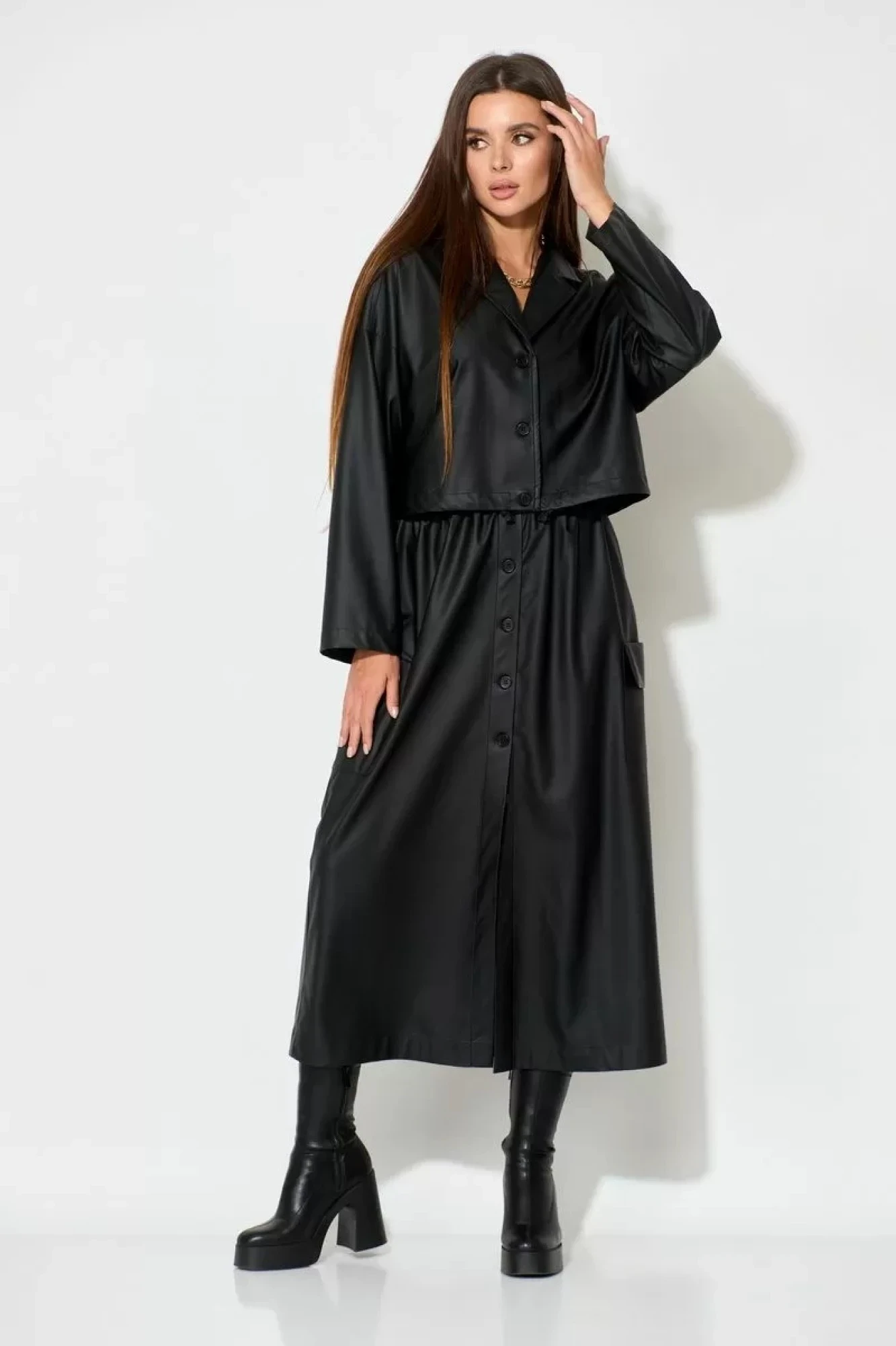 Уникальный комплект из матовой эко-кожи, состоящий из юбки миди и укороченной рубашки. Юбка на поясе со сборкой, спереди с застежкой на пуговицах. Пояс стабильный с настроченными шлевкам. Карманы в боковых швах юбки, также на боковых швах есть накладные карманы с клапаном. Рубашка свободного прямого кроя, с застежкой на пуговицы. Воротник стояче - отложной. Линия плеча спущена, рукав прямой, одношовный. Спинка с отрезной кокеткой, выделенной отделочной строчкой. По низу изделия кулиска с резинкой и фиксаторами, дает возможность затягивать низ по желанию на любую ширину. Комплект юбки миди с укороченной рубашкой можно прекрасно комбинировать с топами, утепленными гольфами и тонкими свитерами.В качестве аксессуаров отлично подходят лодочки, ботильоны, кеды и кроссовки. Длина юбки по боковому шву с поясом 90 см. Длина рубашки по центру спинки 44 см. Длина рукава от шва втачивания воротника 73 см.