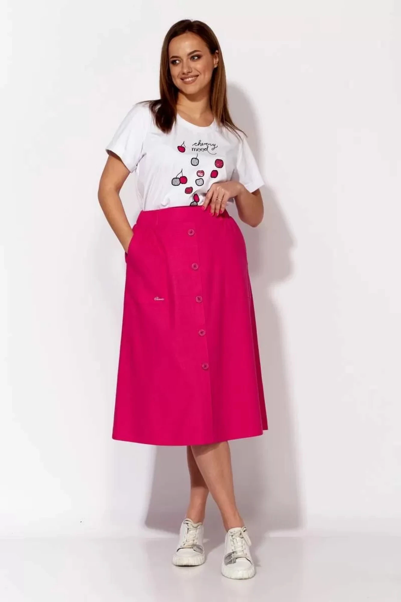 Комплект женский, 2х предметный, состоящий из футболки и юбки. Футболка прямого силуэта с коротким рукавом, по низу с отворотом. Вырез горловины круглой формы с подрезной бейкой. Перед задекорирован вышивкой. Юбка типа- колокол. По центру переда отлетная планка, зафиксированная пуговицами. Карманы накладные с отделочной нашивкой. Пояс притачной , частично на резинке. Центральная часть пояса без резинки. юбка без подкладки.