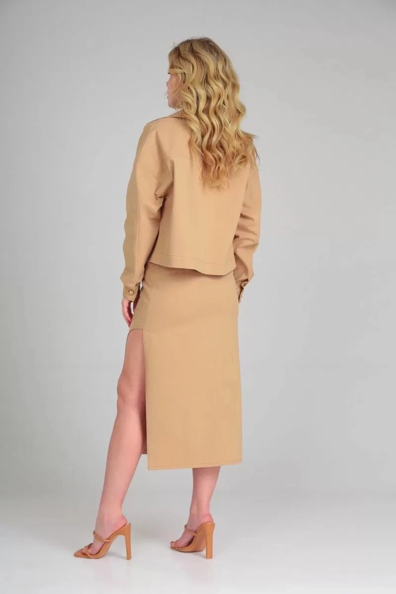 Юбка из тонкой джинсовой ткани четырехшовная, с карманами, гульфиком с застежкой-«молнией», на поясе с застежкой на петли и пуговицы. На левом полотнище скругленный подрез от середины бедра.