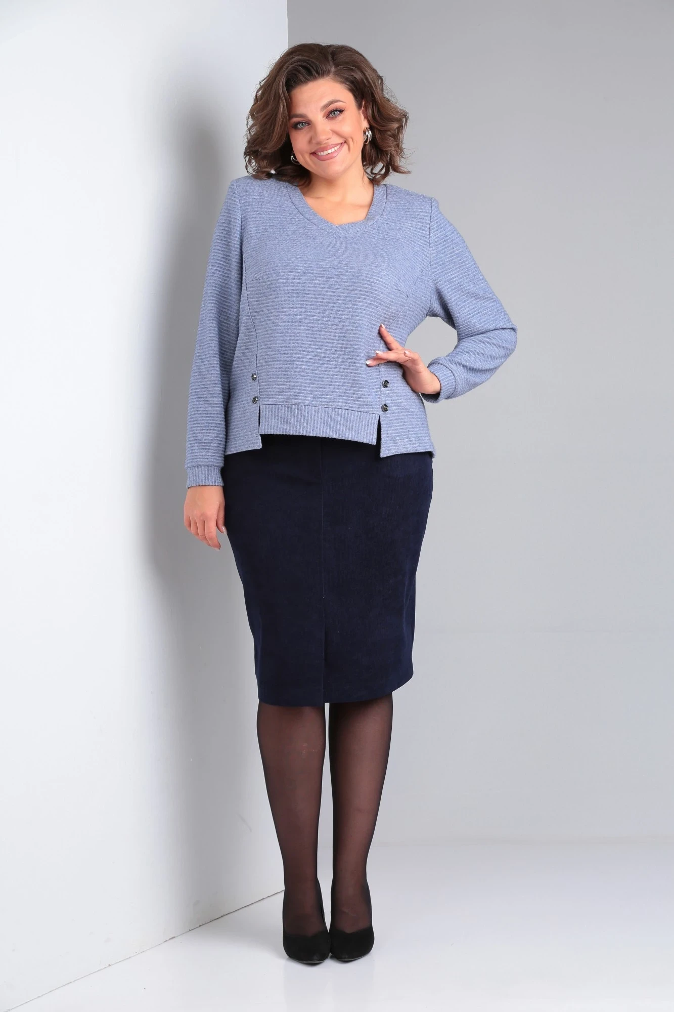 Актуальный женский комплект, состоящий из трикотажного джемпера и вельветовой юбки, отлично подойдёт как для работы, так и для свободного времени. Джемпер свободного кроя, выполнен из мягкого, приятного к телу трикотажа. На переде обработаны нагрудные вытачки, рельефные швы с разрезами внизу, манжета. Спинка цельная. Низ изделия разноуровневый. Рукав втачной, длинный, по низу на манжете. Горловина V-образной формы, обработана планкой.