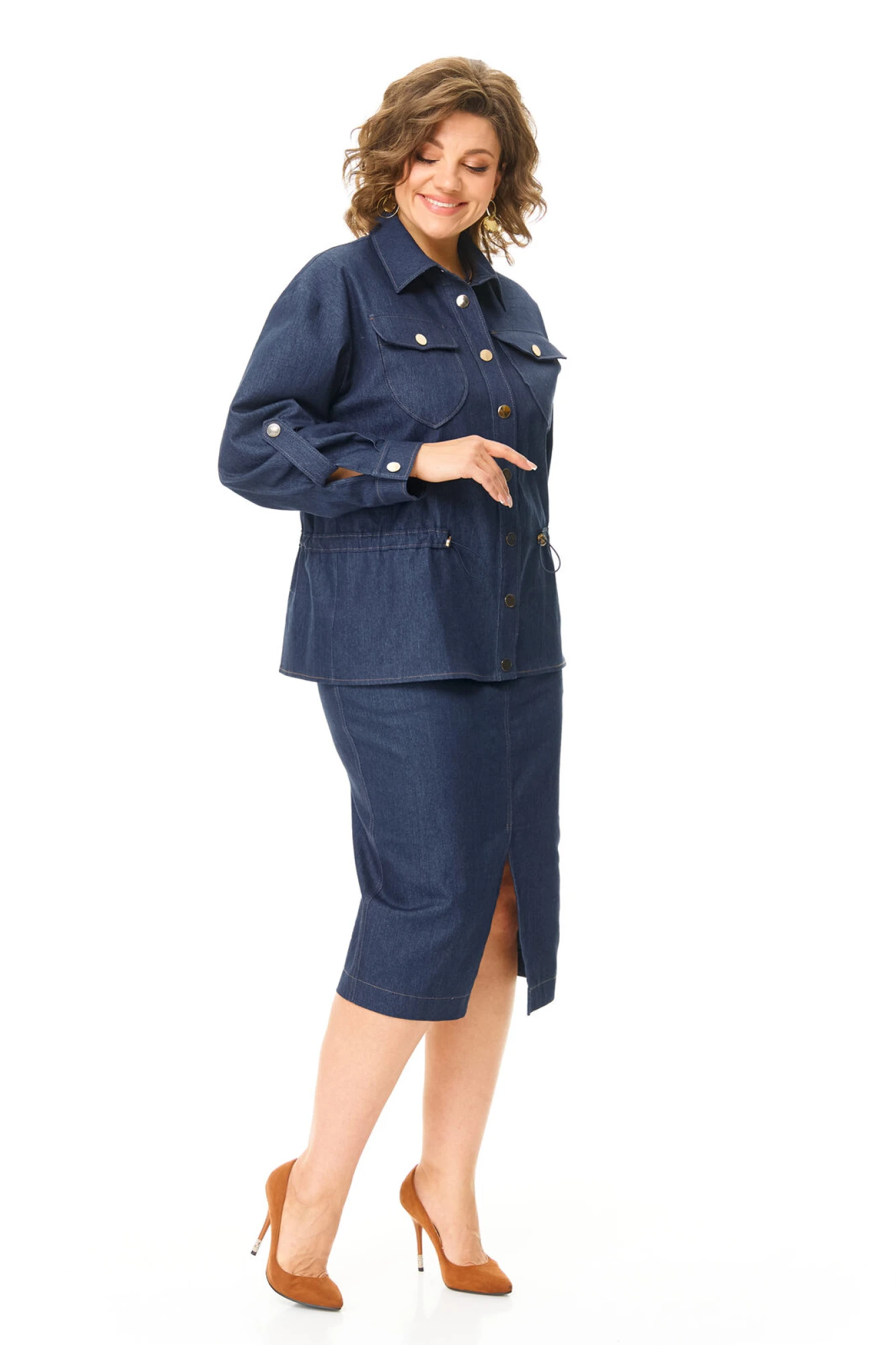 Комплект женский состоит из жакета и юбки. Жакет прямого свободного покроя со спущенной линией плеча.По переду обработана планка.Застежка центральная бортовая на золотые кнопки.По спинке и переду обработана кулиса со втянутой шляпной резинкой и золотыми фиксаторами.Воротник отложной.Рукав длинный с защипами по низу и патой.Низ рукава обработан притачной манжетой с застежкой на золотую кнопку.По переду имеются накладные карманы авторской формы и клапанами.Юбка миди зауженная к низу с разрезом спереди.Застежка на переднем полотнище на молнию и пуговицу.В боковых швах карманы с отрезным бочком.Заднее полотнище со средним швом.Пояс притачной с резинкой в боковых швах.Отделочные строчки контрастного цвета.Вся фурнитура металлическая premium качества.