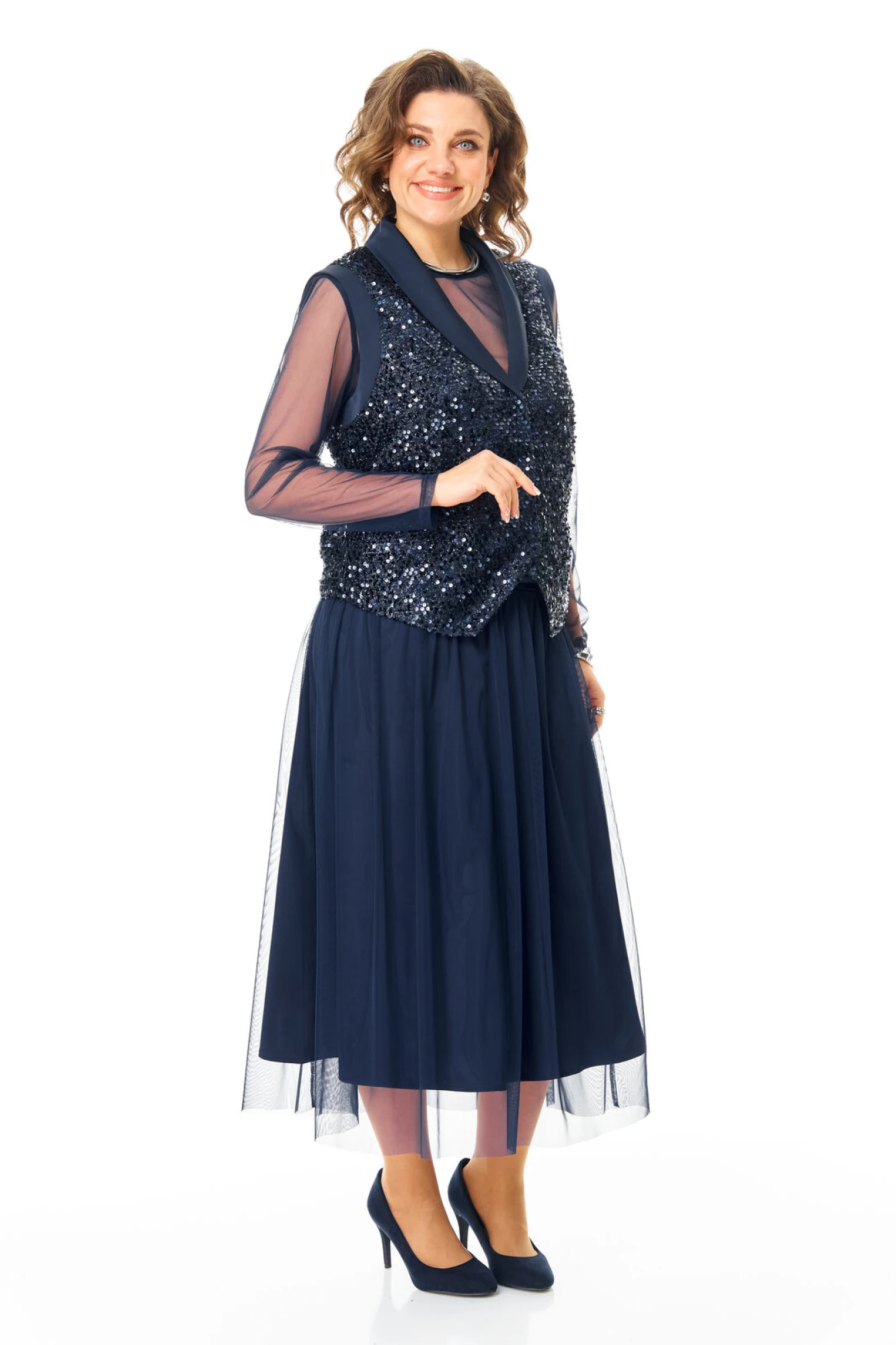 Комплект женский состоит из жилета, топа и юбки.Жилет полуприлегающего покроя на подкладке из шелковой атласной ткани.Пред и спинка выполнены из полотна с пайетками.По проймам выполнены бейки из атласной ткани.Низ жилета фигурной формы.Застёжка однобортная на потайные кнопки.Воротник отложной типа "шаль" из атласной ткани.Топ свободного покроя из полотна сетка.Горловина округлой формы, окантована.Рукав длинный. Юбка расширенная к низу длинной миди, двух слойная и двух уровневая. Нижний слой из шелковой атласной ткани, верхний из полотна сетка.Для удобства и свободы движения пояс на круговой резинке.