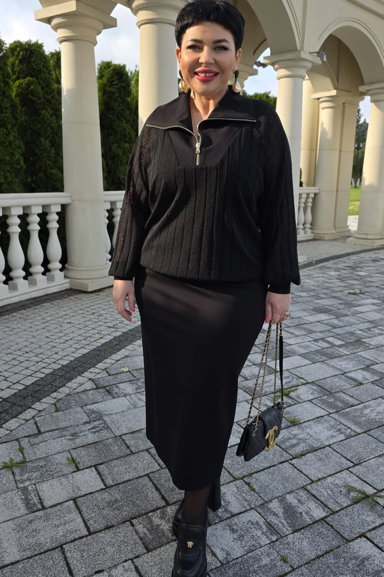 Комплект женский, состоящий из джемпера и юбки. Джемпер черного цвета, из полупрозрачного материала, его фактура — эффект гофре — это складки, они играют со светом, то поглощая его, то отпуская, создавая живое, дышащее полотно. Джемпер свободного силуэта, с планкой из отделочного материала переходящей в отложной воротник с застёжкой на декоративную тесьму-молнию. Рукав в джемпере- реглан со сборкой на притачную манжету из отделочной ткани. По спинке джемпера фигурная кокетка из отделочной ткани. Низ со сборкой на эластичную тесьму-резинку. Юбка прямого силуэта, удлинённая, зауженная книзу. Пояс в юбке притачной со вставкой в бочках декоративной тесьмы-резинки для удобного прилегания. В среднем шве заднего полотнища юбки застёжка на декоративную молнию, и разрез от низа. Обращаем Ваше внимание, что фурнитура может незначительно отличаться от фото. Длина джемпера 67 см (р 50-54), 67,5 см (р 56-60), длина рукава 64 см (р 50-54), 65 см (р 56-60). Длина юбки 81 см.