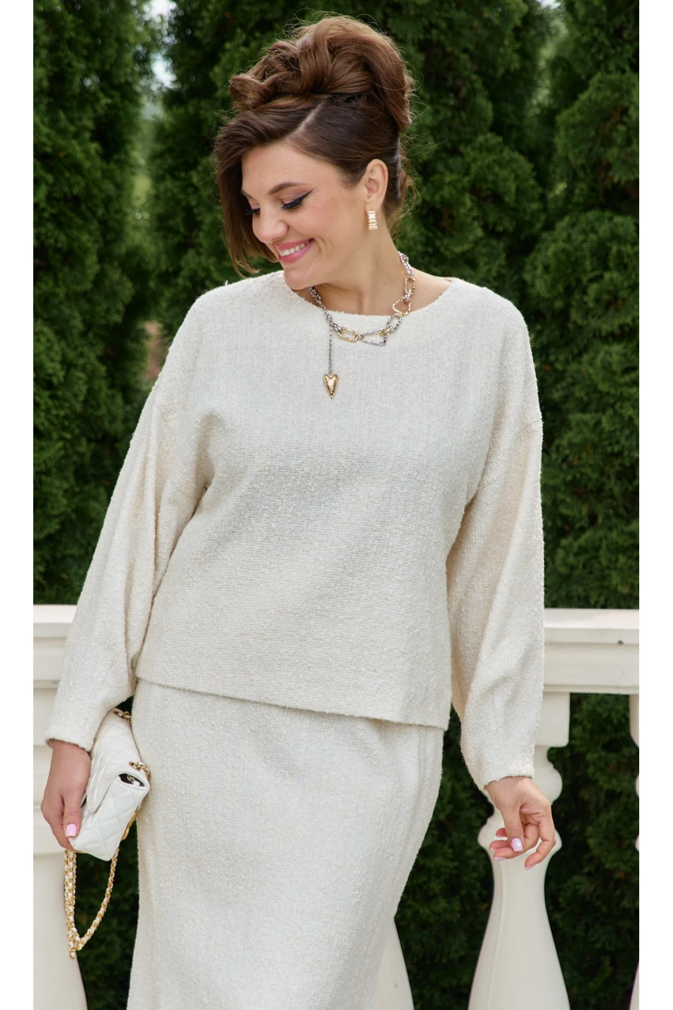 Безумно красивый и элегантный костюм в модном оттенке «сливочного масла» мягко обволакивает фигуру, создавая тем самым шикарный образ. Его стиль, утончённость делает женщину поистине роскошной. Костюм состоит из блузона свободного силуэта и юбки длины «миди» в силуэте «гадэ». Стильный костюм с юбкой "миди" создан в духе последних тенденций! Костюм всегда будет актуален, идеально подойдет как для повседневной носки так и для торжественных выходов. Блузон свободного силуэта, с округлой формой горловины, линия плеча спущенная. Рукав втачной, длинный с застроченными вытачками от низа. Спинка в блузоне без особенностей. Юбка силуэта «гадэ» длины миди, обеспечивает мягкое прилегание по бёдрам, дарит комфорт подчёркивая фигуру благодаря крою. Пояс в юбке притачной, со вставкой эластичной тесьмы-резинки в бочках пояса. По переднему и заднему полотнищу юбки- вертикальные рельефы. В среднем шве юбки застёжка на потайную тесьму-молнию и пуговицу в поясе. Юбка на подкладке.