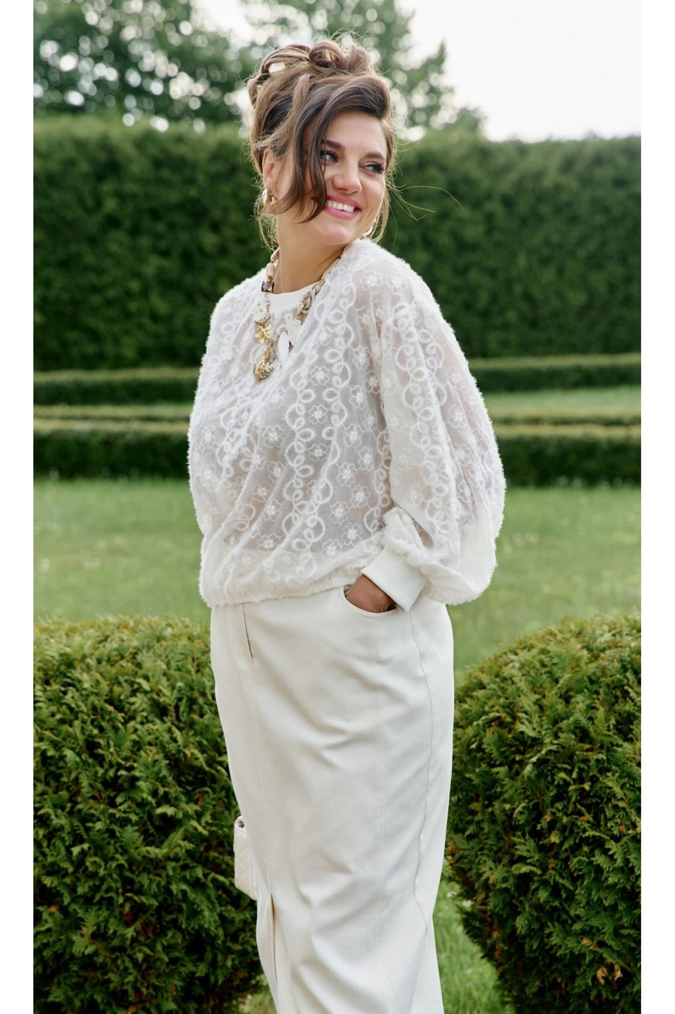 Женский комплект, состоящий из блузона из полупрозрачной ткани в изысканную пушистую вышивку и юбки длины «миди» из плотного джинса, представляет собой идеальное сочетание комфорта, стиля и универсальности. Данный комплект идеально подходит как для повседневной носки так и для создания стильных образов на выход. Он легко комбинируется с различными аксессуарами и обувью, позволяя экспериментировать и находить новые комбинации в вашем стиле. Блузон выполнен из тонкой прозрачной с вышивкой ткани, которая актуальна в этом сезоне. Верх свободного силуэта, со спущенной линией плеча, низ присобран на тесьму-резинку. Горловина без воротника округлой формы обработана трикотажной эластичной планкой. Рукав втачной, одношовный, из основной ткани со сборкой по низу и притачной манжетой из эластичного трикотажа. Юбка из джинсовой ткани без подкладки, прямого силуэта, длины «миди». По переду юбки средний шов со шлицей и застежкой молния вверху на петлю и пуговицу также джинсовые карманы и боковые рельефы с двойной отстрочкой. Задняя часть также со средним швом и шлицей внизу. Пояс в юбке притачной на эластичной тесьме-резинке, которая обеспечивает максимально удобную посадку на любой тип фигуры.