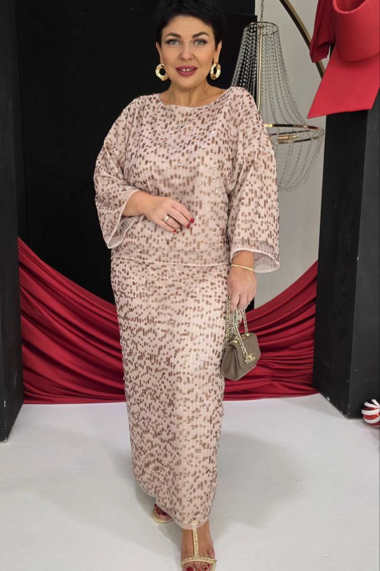 Изящный костюм состоит из блузы и юбки миди, украшенных крупной пайеткой пудрово-розового оттенка. Совокупность текстур делает акцент на женственности и утонченной роскоши: пудрово-розовый оттенок дарит мягкость и нежность, а крупная пайетка добавляет ансамблю праздничности и солнечного блеска. Пайетки крупной величины рассыпаны по всей поверхности, образуя эффект мягкого мерцания. Это наряд, который подойдет для вечерних мероприятий, светских раутов и торжественных встреч, вызывая восхищение и спокойную уверенность в себе.Блуза свободного силуэта, с округлой линией горловины. Линия плеча в блузе спущенная, рукав втачной, длиной 7/8. Спинка без особенностей. Низ в блузе ассиметричный. Блуза на отлетной подкладке. Юбка прямого силуэта, длины миди с притачным поясом с эластичной тесьмой-резинкой в круговую, что обеспечивает максимально удобную посадку на любой тип фигуры. В среднем шве юбки разрез от низа. Юбка на подкладке. Длина блузы по спинке 67 см (р 50-54), 68 см (р 56-60), длина рукава 31 см. Длина юбки 90 см.