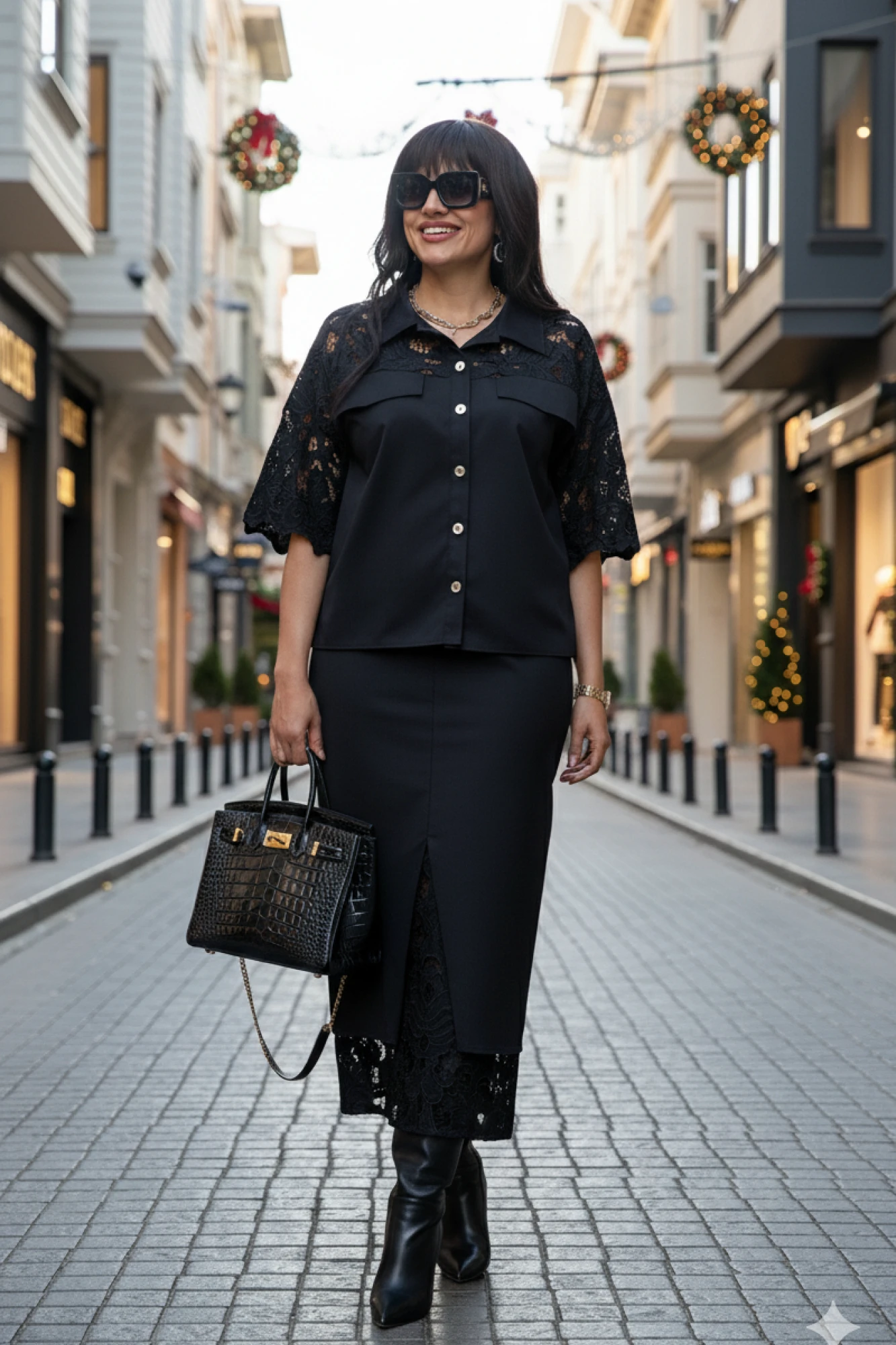 Костюм юбочный женский, состоящий из блузки и юбки. Комбинация однотонного хлопка и вышитого гипюра в тон создаёт ощущение монолитности и изысканности. Верх и низ костюма образуют единое целое: простая, сдержанная геометрия блузы подается как холст для элегантности юбки, превращая костюм в идеальный выбор для событий, где важна сдержанность и сила стиля.Блузка свободного силуэта, укороченная, с центральной застёжкой на петли-пуговицы по планке, низ в блузке ассиметричный. Воротник в блузе рубашечного типа. По переду блузки отрезные кокетки из отделочной ткани в тон- гипюра на просвет, декоративными клапанами. Спинка в блузке с отрезной кокеткой из отделочной ткани в тон-гипюра на просвет. В боковых швах блузки разрезы с декоративным элементом в виде паты, фиксирующейся отделочной пуговицей. Рукав в блузке втачной, длиной ¾, из отделочной ткани-гипюра с фестонами по низу.Юбка прямого силуэта, длины миди, с застёжкой на тесьму-молнию в гульфике и пуговицу в поясе, по переду юбки средний шов переходящий в разрез, и прорезные карманы. Заднее полотнище юбки со средним швом. Пояс притачной, со вставкой эластичной тесьмы-резинки в бочках. Юбка на подкладке, к подрезу подкладки притачивается деталь из отделочной ткани-гипюра в тон.