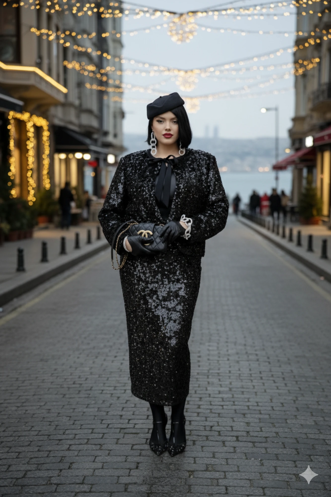 Общий образ — минимализм цвета и максимальная выразительность текстур. Материалы будто говорят на языке контраста: атласный блеск в блузе гармонично сочетается с зеркальной, перламутровой игрой пайетки. Этот комплект создает ощущение современной роскоши для вечерних выходов, деловых мероприятий и торжественных приемов, где ценят изящество без лишних деталей, спокойную уверенность и плавное движение света. Комплект женский, трёх-предметный, состоящий из жакета, блузы и юбки.Жакет (состав: 100% полиэстер, подкладка 100% полиэстер) укороченный, свободного силуэта, без застёжки, с акцентом на ровную линию плеч. Головина округлой формы с прилегающей стойкой из отделочной ткани, переходящей в декоративные ленты, завязывающиеся на бант. Спинка без особенностей. Рукав втачной, длинный. Жакет на подкладке.Блуза (состав: 97% полиэстер, 3 % спандекс) в классическом чёрном оттенке, который гармонично сочетается с насыщенным чёрным цветом комплекта. Блуза прямого силуэта с округлой формой горловины и нагрудными вытачками по полочке. Спинка без особенностей. Низ в блузе фигурной формы. Юбка (состав: 100% полиэстер, подкладка 100% полиэстер) длиной миди держит внимание за счет ткани, украшеной в густую, слегка крупную фактурную пайетку. Юбка прямого силуэта с притачным поясом со вставкой эластичной тесьмы-резинки в бочках. В среднем шве заднего полотнища юбки застёжка на молнию и пуговицу в поясе.