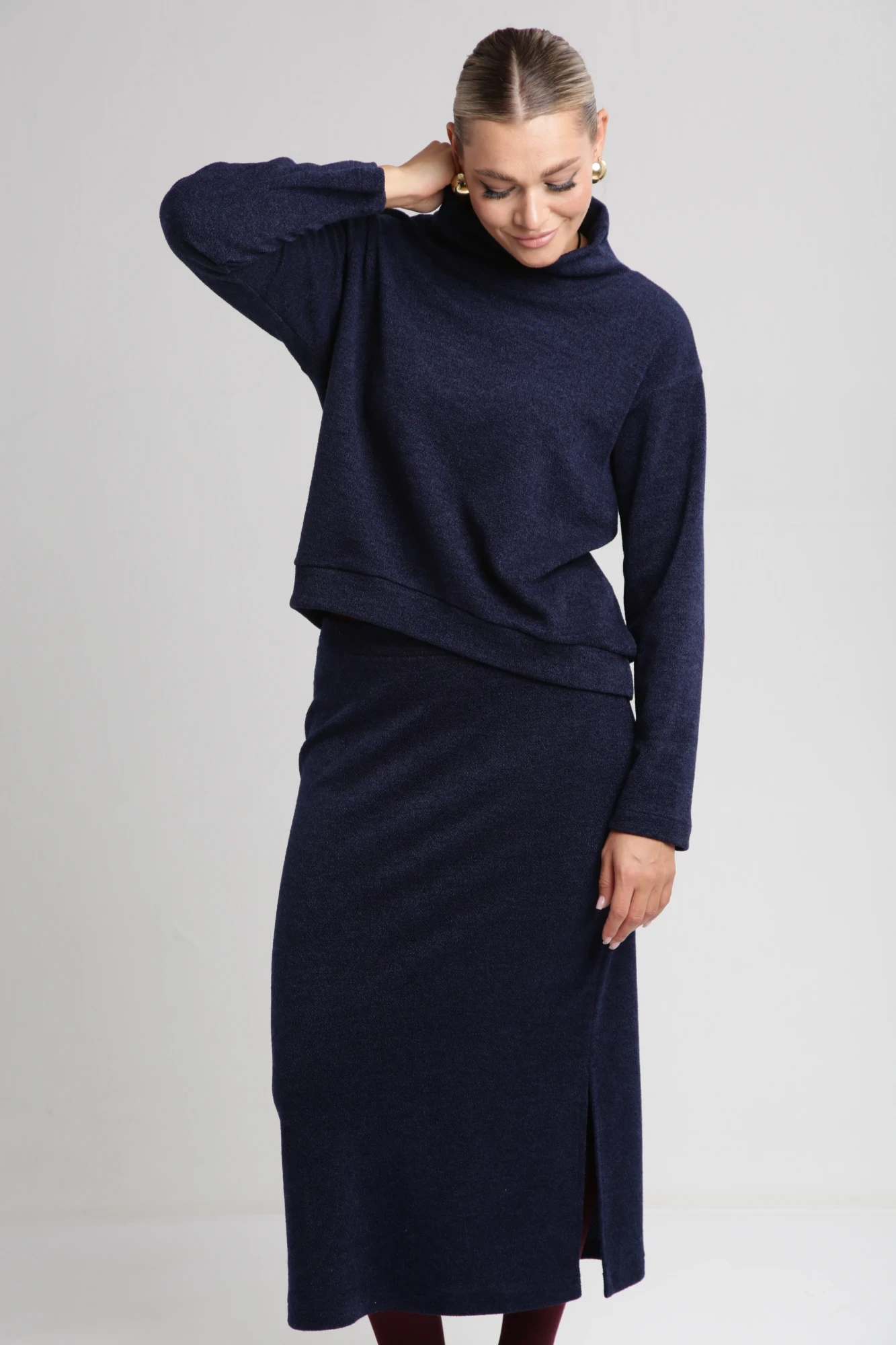 Костюм, состоящий из джемпера и юбки, изготовлен из трикотажного полотна. Джемпер свободного силуэта с асимметричным низом. Воротник-хомут. Рукав втачной, приспущенный.