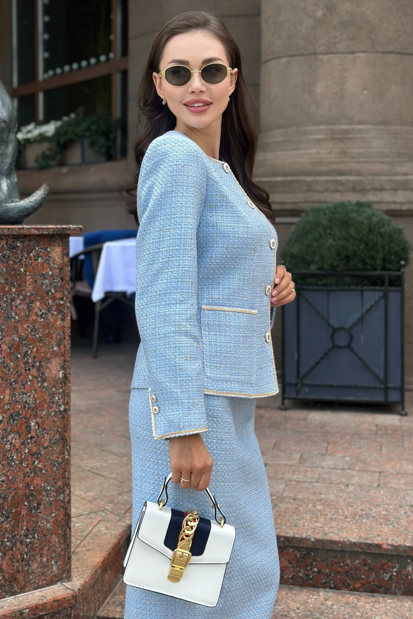 ЖАКЕТ: длина жакета по среднему шву спинки – 59,5 см (±2,0 см), ширина жакета на уровне глубины проймы – 52,0 см (±1,0 см), ширина жакета на уровне линии талии – 46,0 см (±1,0 см), ширина жакета на уровне линии бедра – 56,0 см (±1,0 см), длина рукава жакета – 61,0 см (±1,0 см), ширина рукава жакета вверху – 19,0 см (±1,0 см), ширина рукава внизу - 13,5 см (±0,5 см), длина плеча жакета – 11,0 см (±0,5 см). ЮБКА: длина юбки по среднему шву спинки – 79,0 см (±3,0 см), ширина юбки на уровне линии талии – 41,0 см (±1,0 см), ширина юбки на уровне линии бедер – 53,0 см (±1,0 см), ширина юбки на уровне линии низа – 49,0 см (±1,0 см).